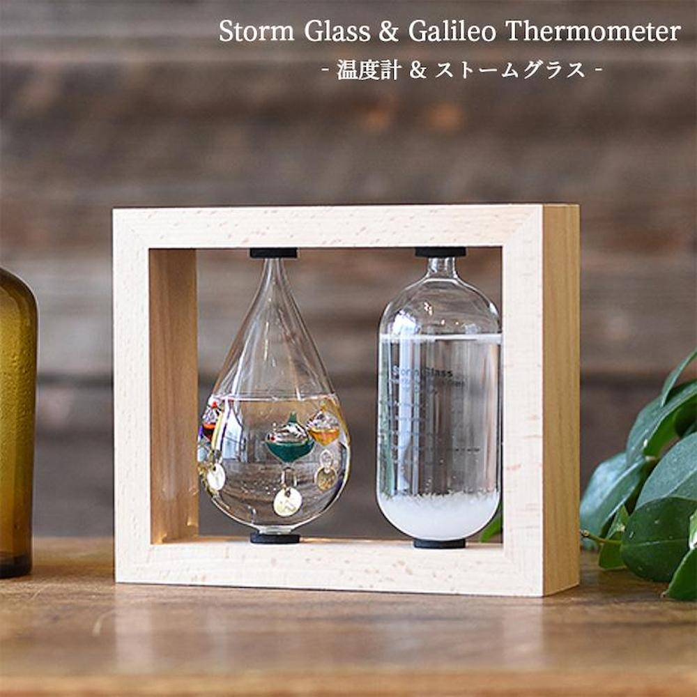 カラフルなガラス球が浮かぶ温度計とストームグラスのセット。液体の比重が温度によって変化する原理を使って作られた温度計と、天候によって結晶の様子が変化すると言われているストームグラスのセットです。インテリアとして、置くだけでも目を楽しませてくれます。■Fun Science■不思議な化学変化や現象をインテリアとして楽しめるシリーズです。