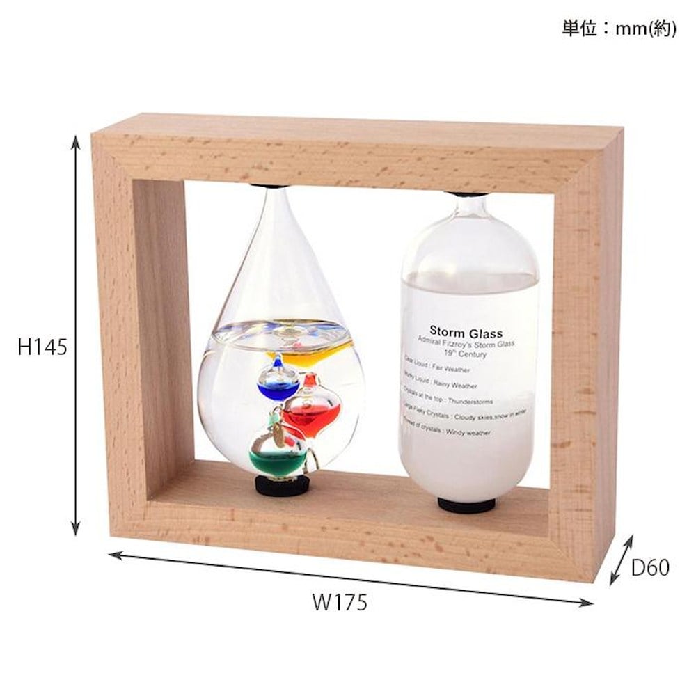 フレーム素材:天然木(ビーチ材)、温度計:ホウケイ酸ガラス、パラフィンオイル他、ストームグラス:ホウケイ酸ガラス、水、エタノール、天然樟脳他