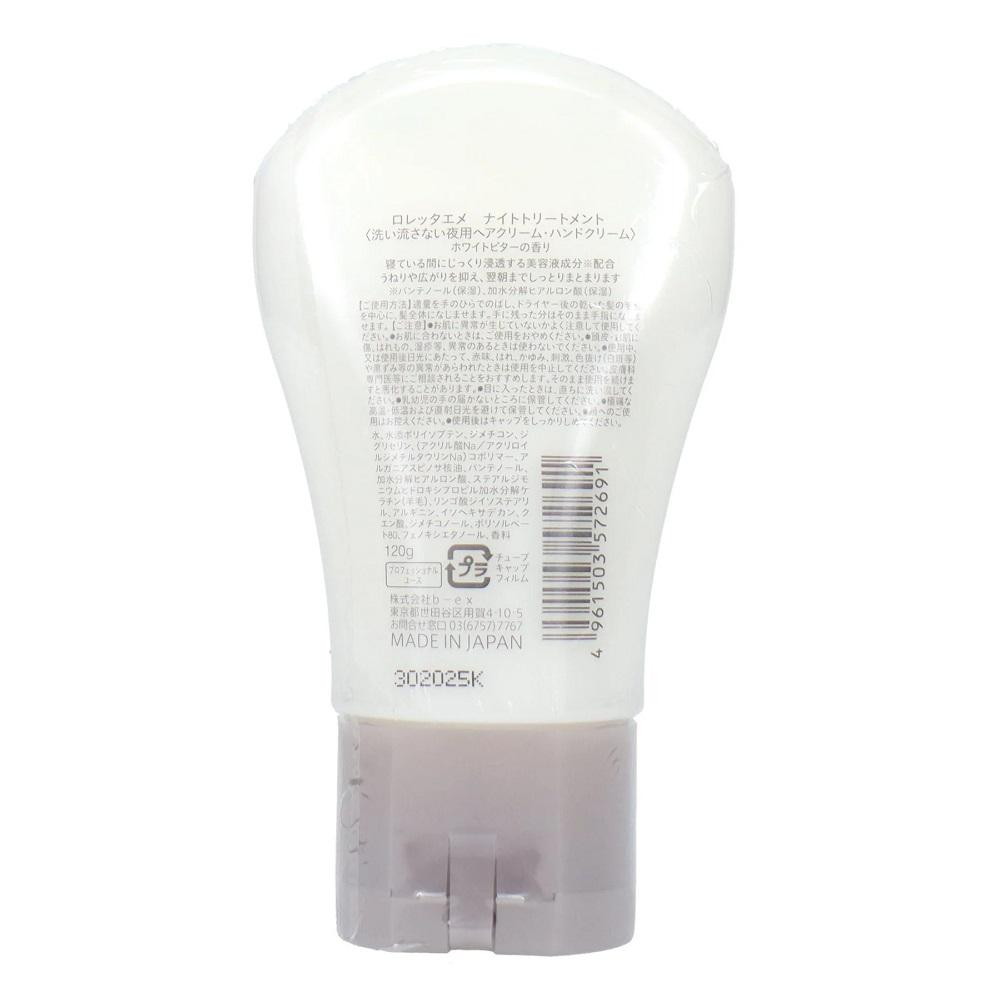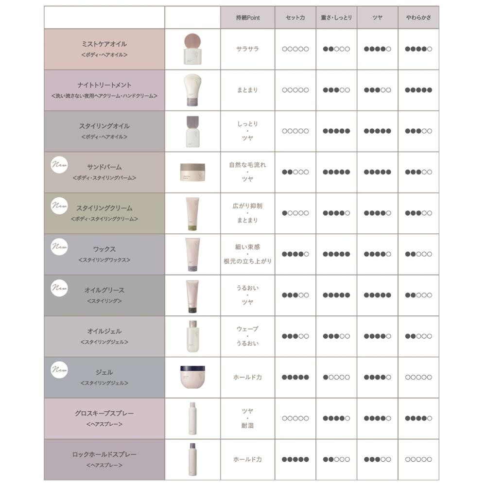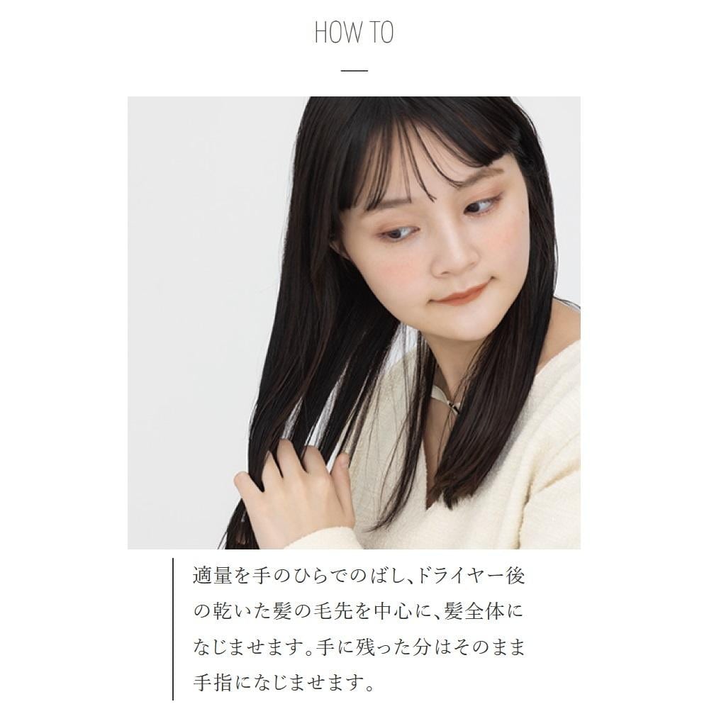 寝る直前の乾いた髪に使う、髪の美容液クリーム 寝ている間にじっくり浸透する美容液成分※1配合。 うねりや広がりを抑え、翌朝までしっとりまとまります。 オイルが苦手な方にもおすすめです。 ※1 パンテノール(保湿)、加水分解ヒアルロン酸(保湿) 翌朝の髪の広がりを抑えたい方、べたつかずにしっとり感が欲しい方に。 美容液成分:パンテノール、加水分解ヒアルロン酸 保湿・ツヤ成分:アルガニアスピノサ核油 うるおい持続成分:パンテノール うるおい浸透成分:加水分解ヒアルロン酸 水分コントロール成分:ステアルジモニウムヒドロキシプロピル加水分解ケラチン(羊毛) セット力:0 重さ・しっとり:3 ツヤ:3 やわらかさ:5 ※5段階評価 (使用方法)適量を手のひらでのばし、ドライヤー後の乾いた髪の毛先を中心に、髪全体になじませます。手に残った分はそのまま手指になじませます。
