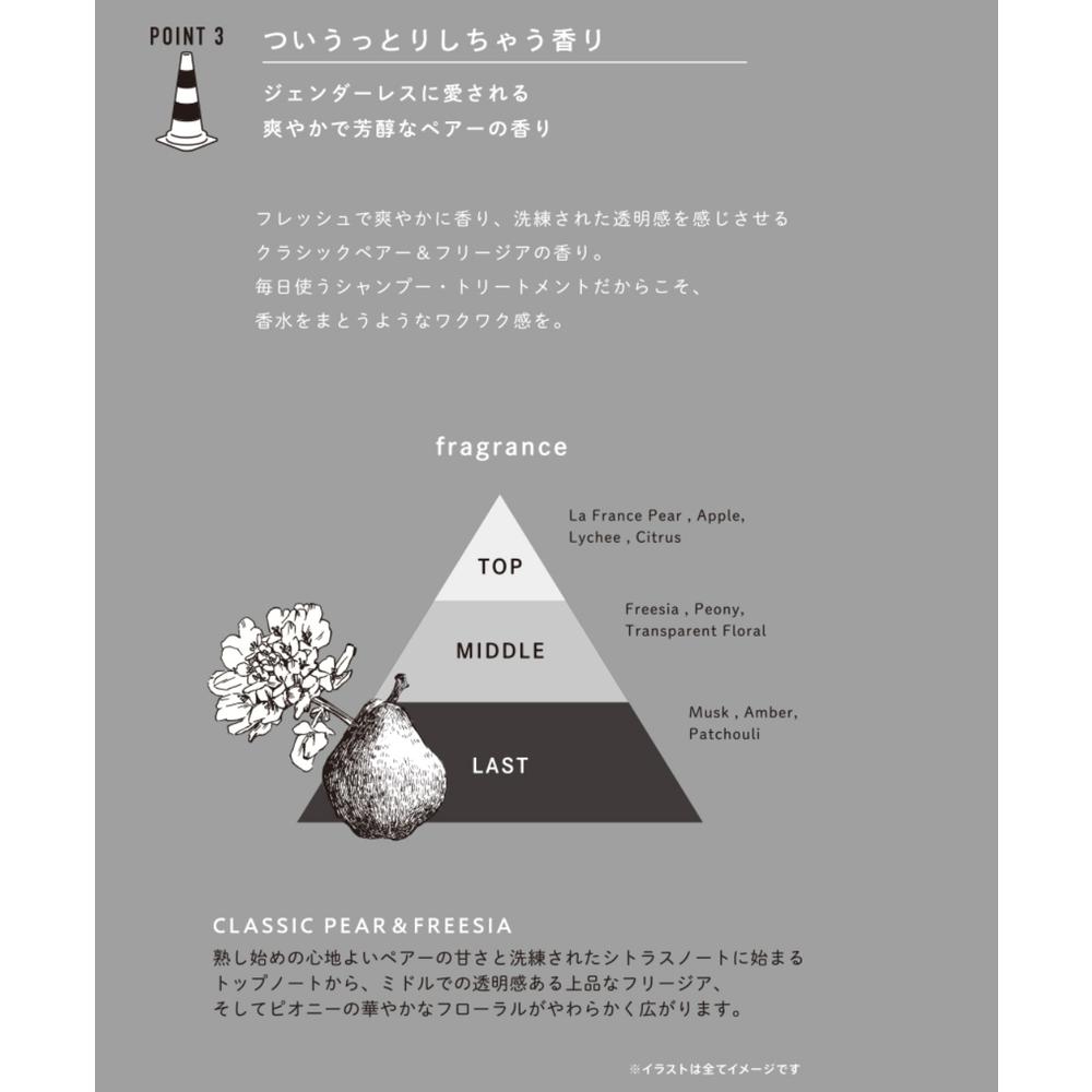 自分史上最高のまとまりへ。 ブースター効果により根元から毛先までおさまりのよい髪へ導きます。ゴワつきの原因となる金属イオンにシャンプーの洗浄成分が吸着。毛髪表面を整えます。きめ細かいモコモコの泡で洗い上げることで、ダメージ毛やブリーチ毛でも、シャンプー中の絡まりやキシみ感ががなくストレスフリー。トリートメント成分を含んだ泡でしっかり補修ケアすることで、ドライ中や乾かした後も、ずっと触っていたくなる髪に。ジェンダーレスに愛される爽やかで芳醇なペアーの香り。 ヘアカラーを繰り返して髪がバサバサな方、髪が広がってまとまらない方に。
