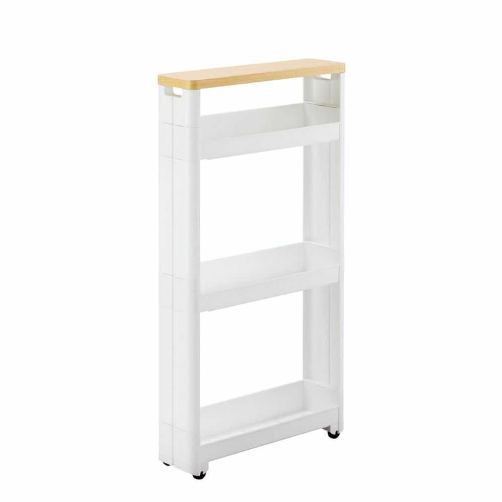 幅12.5cmのスキマが大容量収納庫になるワゴンです。 下段に2Lペットボトルであれば4本も入る収納力です。 奥行45cmは食器棚横に最適です。 木天板が木目調なので温かみがありお部屋に馴染みます。 木天板4段タイプです。 側板の板が目隠し代わりになります。 コロ付きで出し入れ簡単です。 清潔感のあるホワイトカラーです。 様々なシーンでスペースを有効活用できます。 お手入れのしやすいプラスチック製。 工具不要で組み立て簡単です。