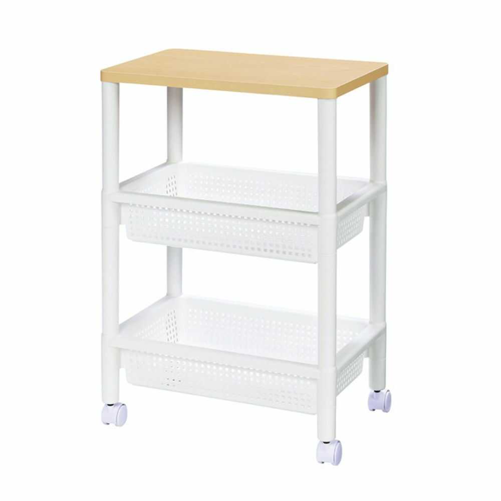 木目調の天板を使用しています。 丈夫で温かみのあるワゴンです。 フラットな天板なので、ちょっとしたテーブル代わりにも使用できます。 リビング、キッチン、デスク周りなど様々なシーンに馴染みます。 バスケット棚にはA4サイズが収納可能です。 キャスター付きで移動もラクラクです。 3段タイプです。 お手入れのしやすいプラスチック製です。
