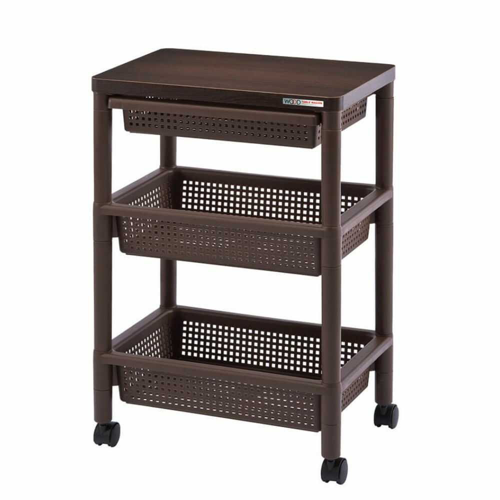 木目調の天板を使用しています。 丈夫で温かみのある引き出し付きワゴンです。 フラットな天板なので、ちょっとしたテーブル代わりにも使用できます。 リビング、キッチン、デスク周りなど様々なシーンに馴染みます。 バスケット棚にはA4サイズが収納可能です。 キャスター付きで移動もラクラクです。 3段タイプです。 お手入れのしやすいプラスチック製です。 ロングセラー商品です。