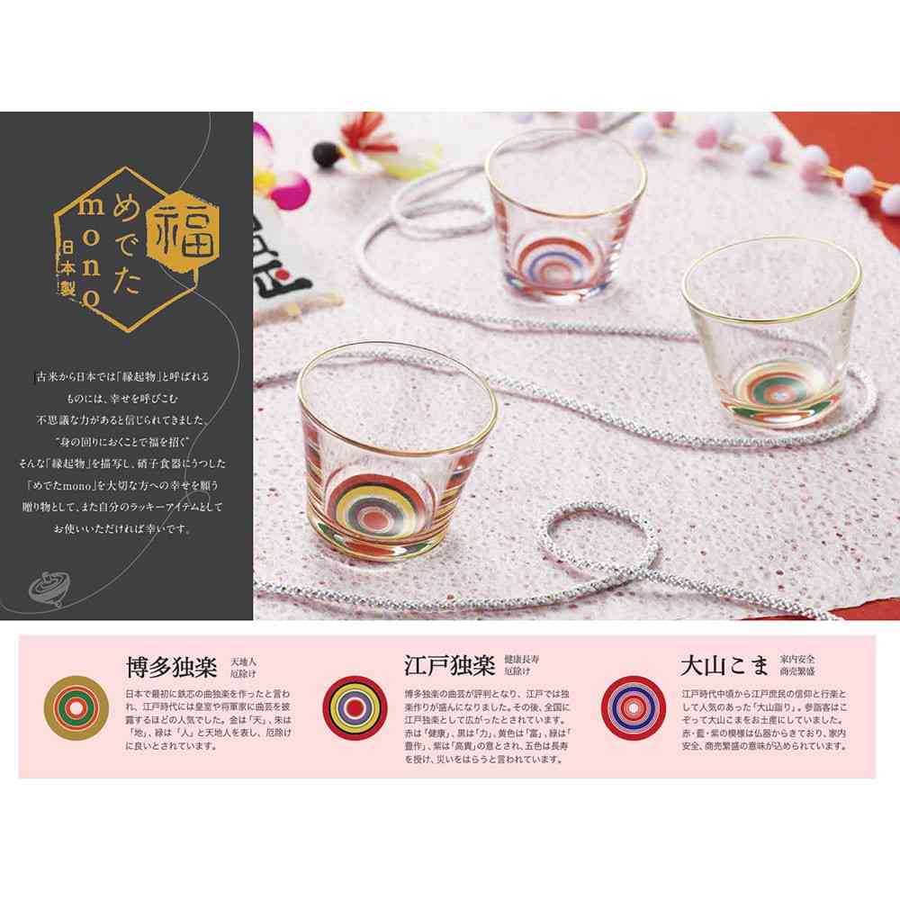 日本各地に残る伝統独楽の魅力的な色彩や絵柄をガラス食器に写しとったグラスシリーズです。元来、独楽には「物事がうまく回る」という縁起がありますが、地域によって色彩や絵柄は異なり、それぞれに大切な縁起が込められています。 【博多独楽】天地人・厄除け…日本で最初に鉄芯の曲独楽を作ったと言われ、江戸時代には皇室や将軍家に曲芸を披露するほどの人気でした。金は「天」、朱は「地」、緑は「人」と天地人を表し、厄除けに良いとされています。 色落ちすることがありますので食器洗い乾燥機でのご使用はお避けください。洗浄の際は優しく手洗いをおすすめします。 成形上、底面中央の膨らみ方に多少のバラつきがございます。また、「実用容量」とは傾けた状態で液体が溢れない容量の目安です。