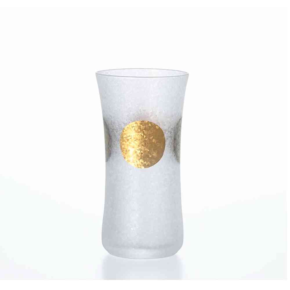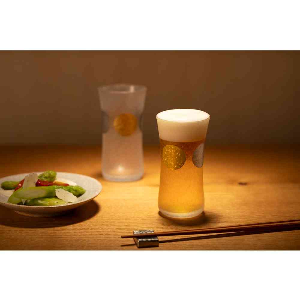 日本の伝統紋様「日月」を施したグラスウェアシリーズです。金の円は太陽、銀の円は月を表します。太陽と月が繰り返し描かれる紋様に「特別な日だけではなく毎日の暮らしの中でこそ上質なものを使っていただきたい」という想いを込めました。「みぞれ仕上げ」によりグラス表面を特殊技術にて涼しげな風合いに仕上げております。 色落ちすることがありますので食器洗い乾燥機でのご使用はお避けください。洗浄の際は優しく手洗いをおすすめします。