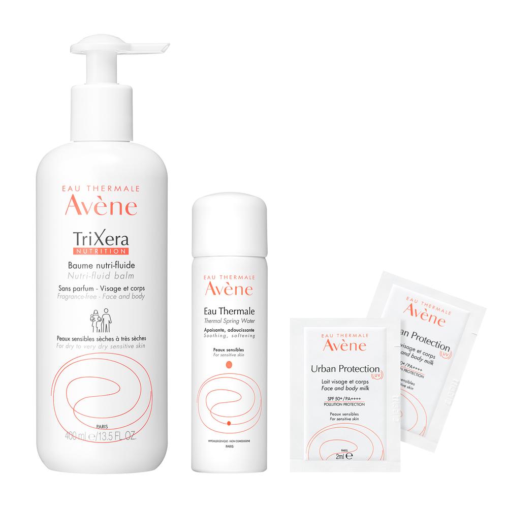 【アベンヌ トリクセラNT フルイドクリーム】 温泉水、グリセリン、パルミチン酸イソプロピル、テトラ(カプリル/カプリン酸)ペンタエリスリチル、ジ(カプリル酸/カプリン酸)PG、トリ(カプリル酸/カプリン酸)グリセリル、ステアリン酸グリセリル、ミリスチン酸ミレス-3、ステアリン酸PEG-100、酢酸トコフェロール、月見草油、カプリリルグリコール、グリシン、ペンチルラムノシド、ダイズ種子エキス、トコフェロール、水、PEG-32、カルボマー、PEG-400、(アクリレーツ/アクリル酸アルキル(C10-30))クロスポリマー、水酸化Na、安息香酸 【アベンヌ ウオーター】 温泉水、窒素 【アベンヌ アーバンプロテクションUV フェイス&ボディ】 温泉水、オクトクリレン、グリセリン、安息香酸アルキル(C12-15)、水、メチレンビスベンゾトリアゾリルテトラメチルブチルフェノール、酸化チタン、t-ブチルメトキシジベンゾイルメタン、アジピン酸ジイソプロピル、ジカプリリルエーテル、ビスエチルヘキシルオキシフェノールメトキシフェニルトリアジン、イソノナン酸セテアリル、シクロペンタシロキサン、ラウリルグルコシド、ジポリヒドロキシステアリン酸ポリグリセリル-2、シクロヘキサシロキサン、ジメチコン、トコフェロール、トコフェリルグルコシド、トリ(カプリル酸/カプリン酸)グリセリル、カプリリルグリコール、シリカ、クエン酸、PG、デシルグルコシド、EDTA-2Na、ソルビン酸、キサンタンガム