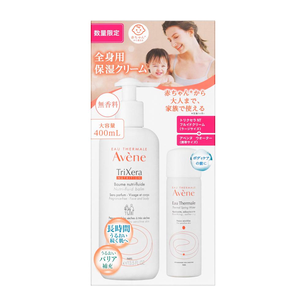 アウトレット販売につき、商品により店舗販売用の防犯用シールや若干の箱潰れがございます。中身には問題ない製品を販売しております。 大切な家族の肌に。 乾燥に負けない肌を育てる全身用保湿クリーム。 生後1ヶ月の赤ちゃんから大人まで家族で使える。 角層のすみずみまでたっぷりうるおいを与え、乾燥や外部刺激から肌を守る。 アベンヌ ウオーター(携帯サイズ)付き限定セット。 [セット内容] ・アベンヌ トリクセラ NT フルイドクリーム <全身用保湿クリーム(敏感肌用)> 400mL ・アベンヌ ウオーター <化粧水(敏感肌用)>50g ※本品は、株式会社 ピエール ファーブル ジャポンの商品です。