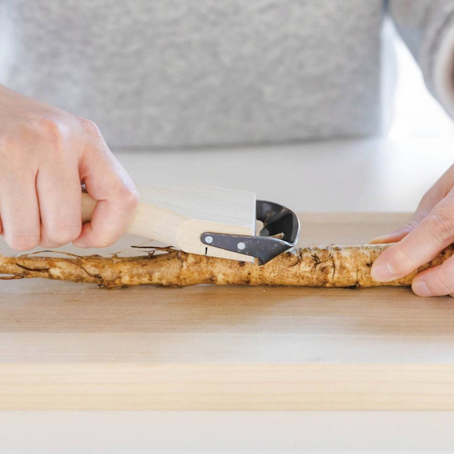 千切りができるピーラーホオノキの木柄を使った千切りピーラー。ステンレスのギザ刃と包丁刃のハガネを使用しております。ギザ刃は3ミリ幅で細い千切りができます。ゴボウやニンジンなどにお使いください。