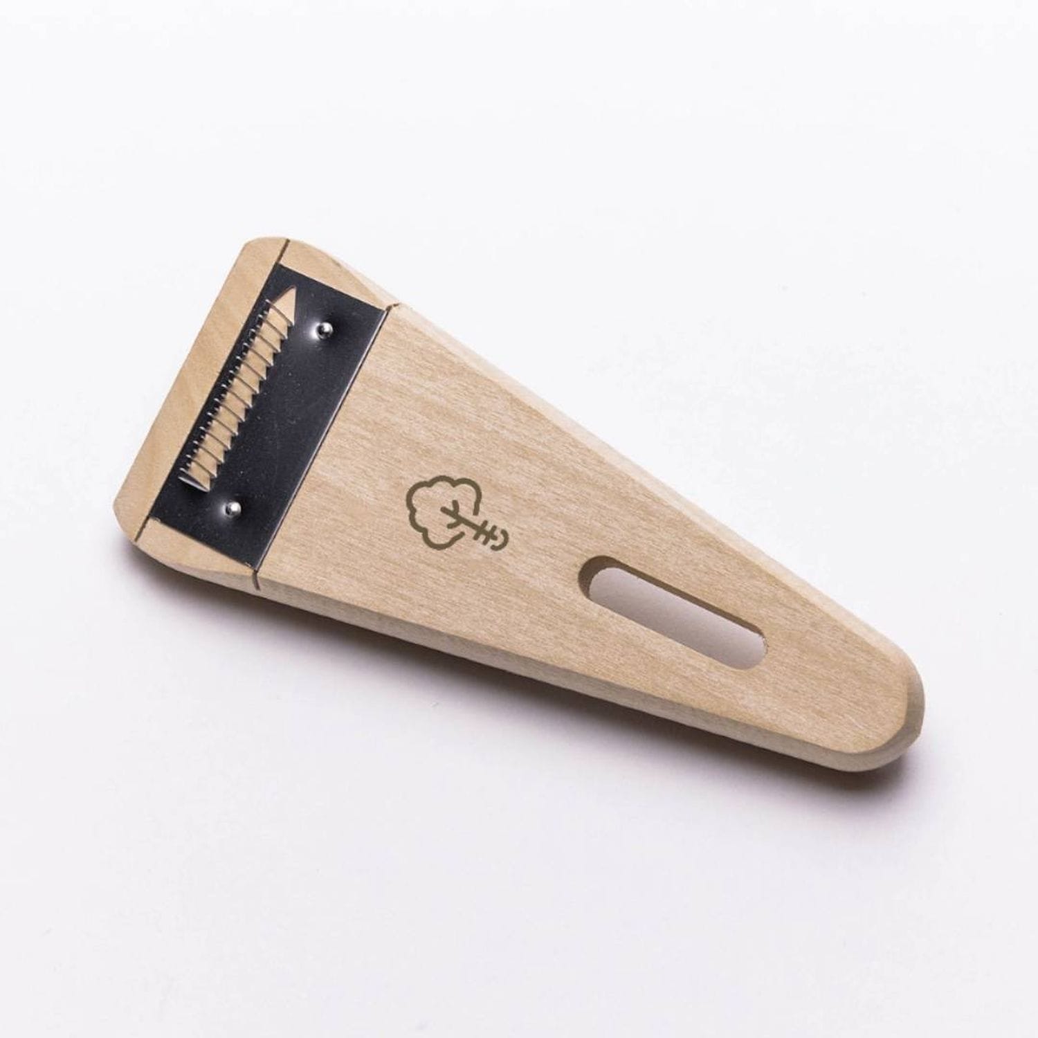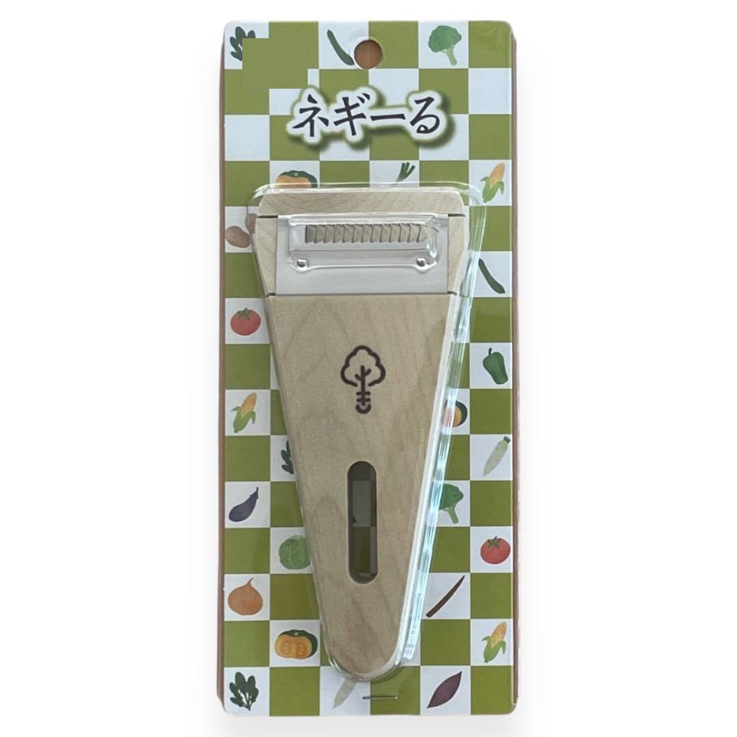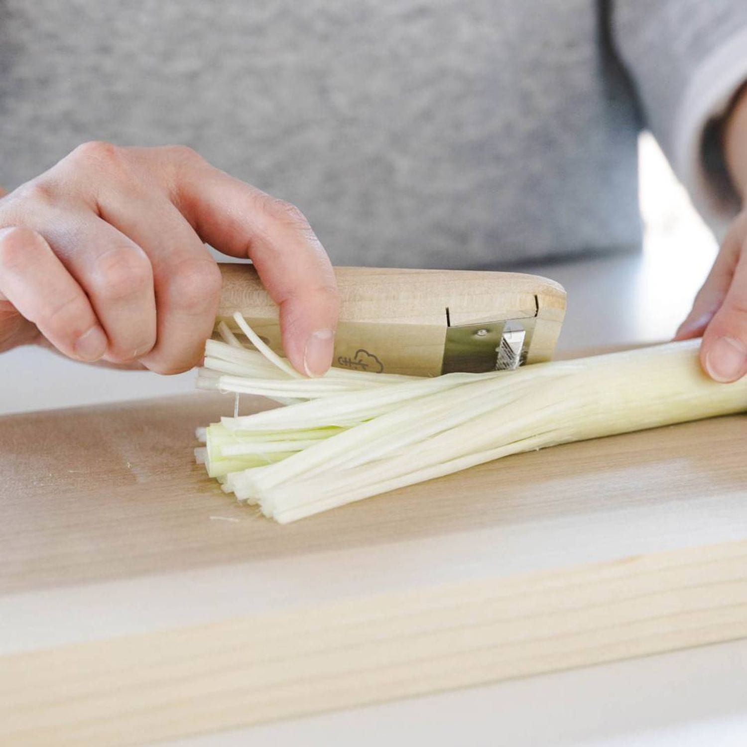 白髪ねぎができる木柄のピーラー白髪ねぎができる、ホオノキを使用した木柄のねぎ千切りピーラー。まな板の上に長ねぎを置き、ステンレスのギザ刃で葉の方向から根元へ向かって引くことで白髪ねぎができます薬味やラーメンの具、日本料理や中華料理など幅広くお使いください。