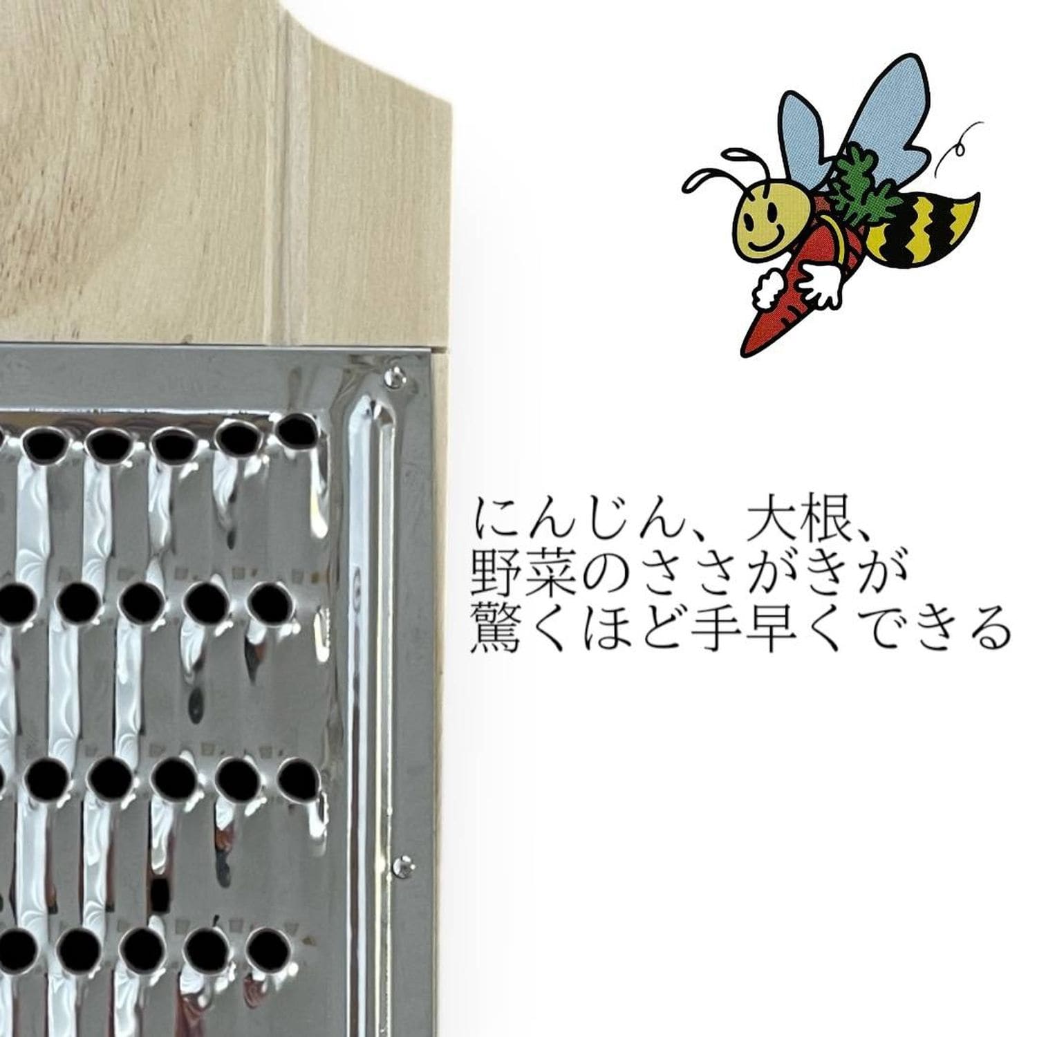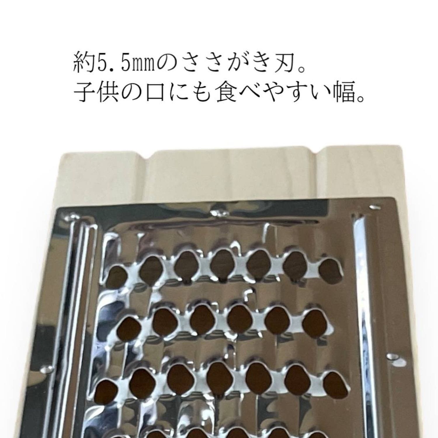 栄養が豊富のにんじんしりしりに木部はホオノキ使用で、刃部はステンレスを使用したささがき調理器。しりしり器としても販売されていて、栄養満点のにんじんしりしりに多く使われています。刃幅は約5.5ミリ幅でちょうど子供も大人も食べやすい大きさでおろすことができます。大根もおすすめですし、青パパイヤもおすすめです。ぜひお試しください。横端にガイドが付いているので、スムーズにスライスできます。