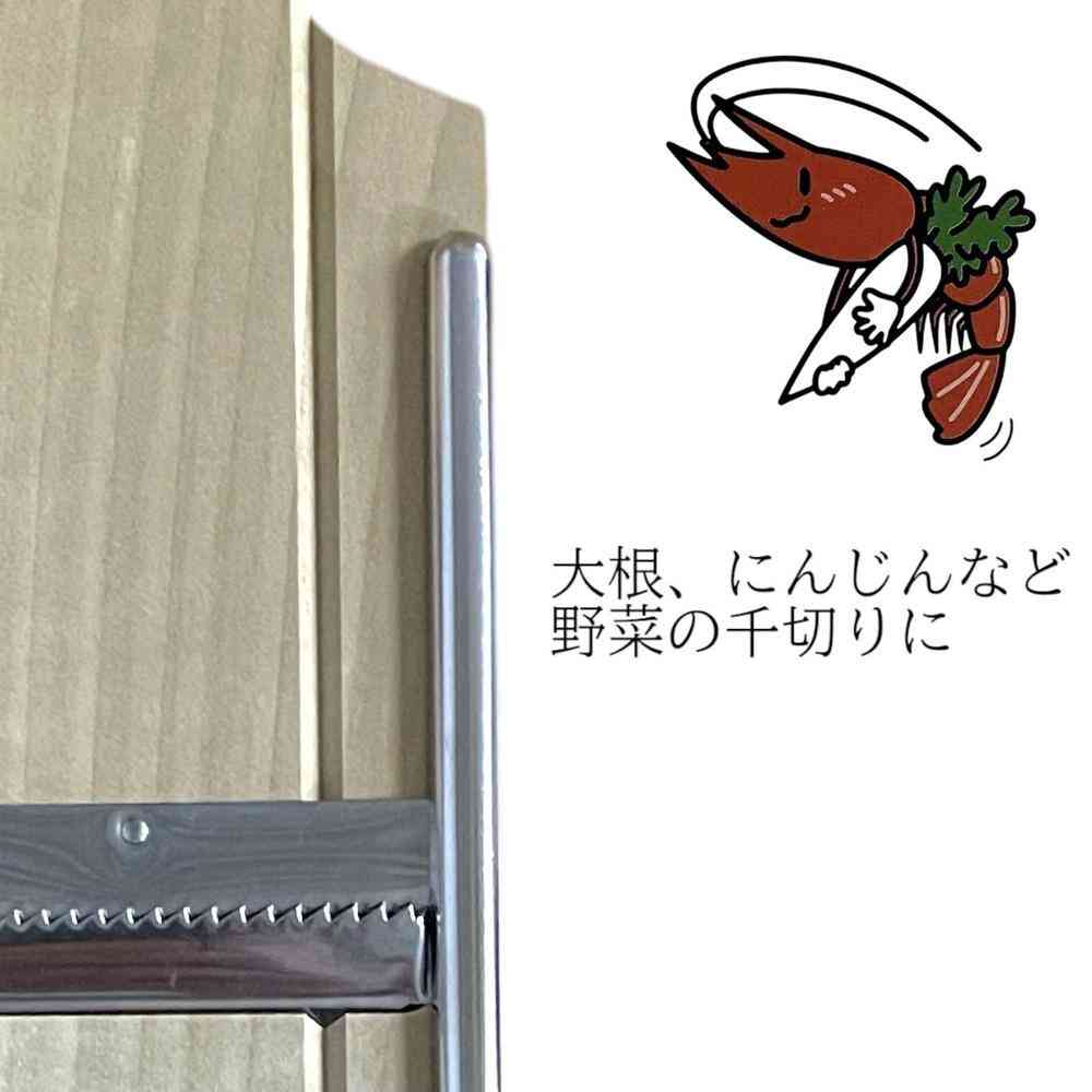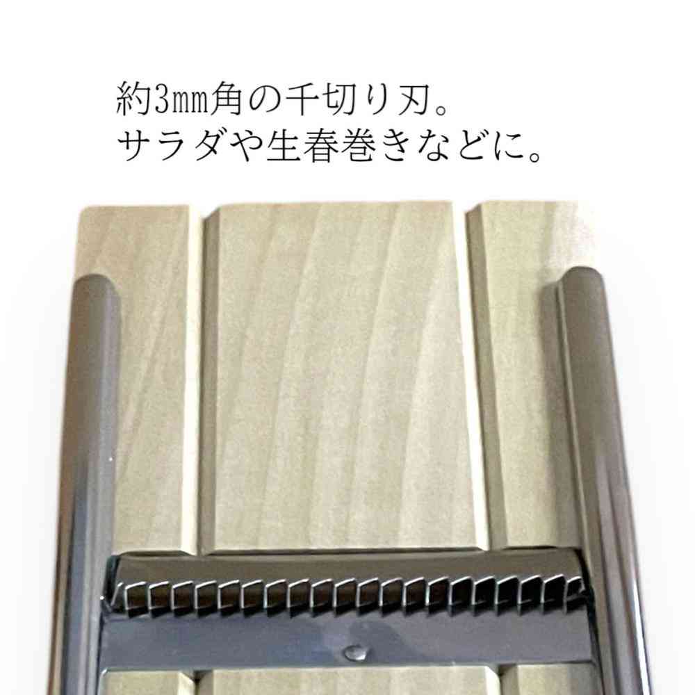 ホオノキを使用した木柄の千切り調理道具。 刃部はステンレスです。 サラダや生春巻きなどに使われています。 刃幅は約3ミリ角となります。 野菜をたくさん食べるのにぜひお試しください。 横端にガイドが付いているので、スムーズにスライスできます。