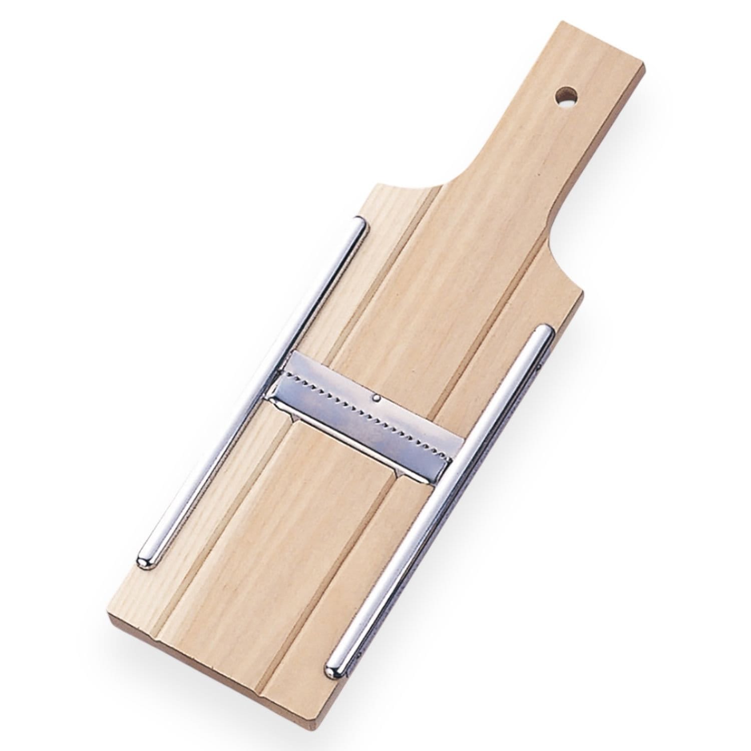 大根、にんじんなど野菜の千切りに千切りが突ける、ホオノキを使用した木柄の千切り調理道具。 刃部はステンレスです。 サラダや生春巻きなどに使われています。刃幅は約3ミリ角となります。 野菜をたくさん食べるのにぜひお試しください。横端にガイドが付いているので、スムーズにスライスできます。