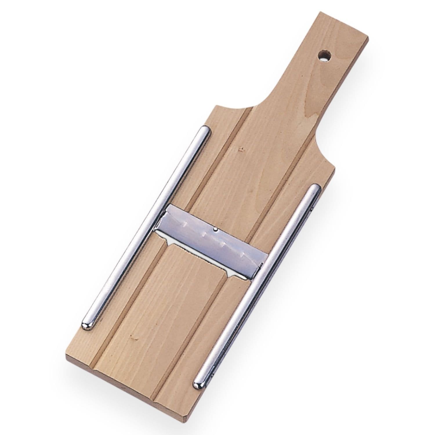 大根、にんじんの短冊切りにたんざくが突ける、ホオノキを使用した木柄のたんざく調理道具。 刃部はステンレスです。 お味噌汁の具などに良く使われています。刃幅は約3×13ミリとなります。 包丁だと大変なたんざく切り、ぜひお試しください。横端にガイドが付いているので、スムーズにスライスできます。