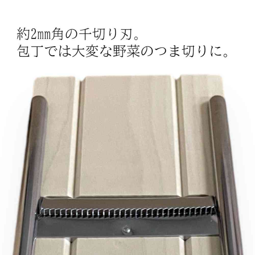 細い千切りが突ける、ホオノキを使用した木柄の千切り調理道具。 刃部はステンレスです。 お刺身のお供、大根のつまなどに使われています。 刃幅は約2ミリ角となります。 横端にガイドが付いているので、スムーズにスライスできます。