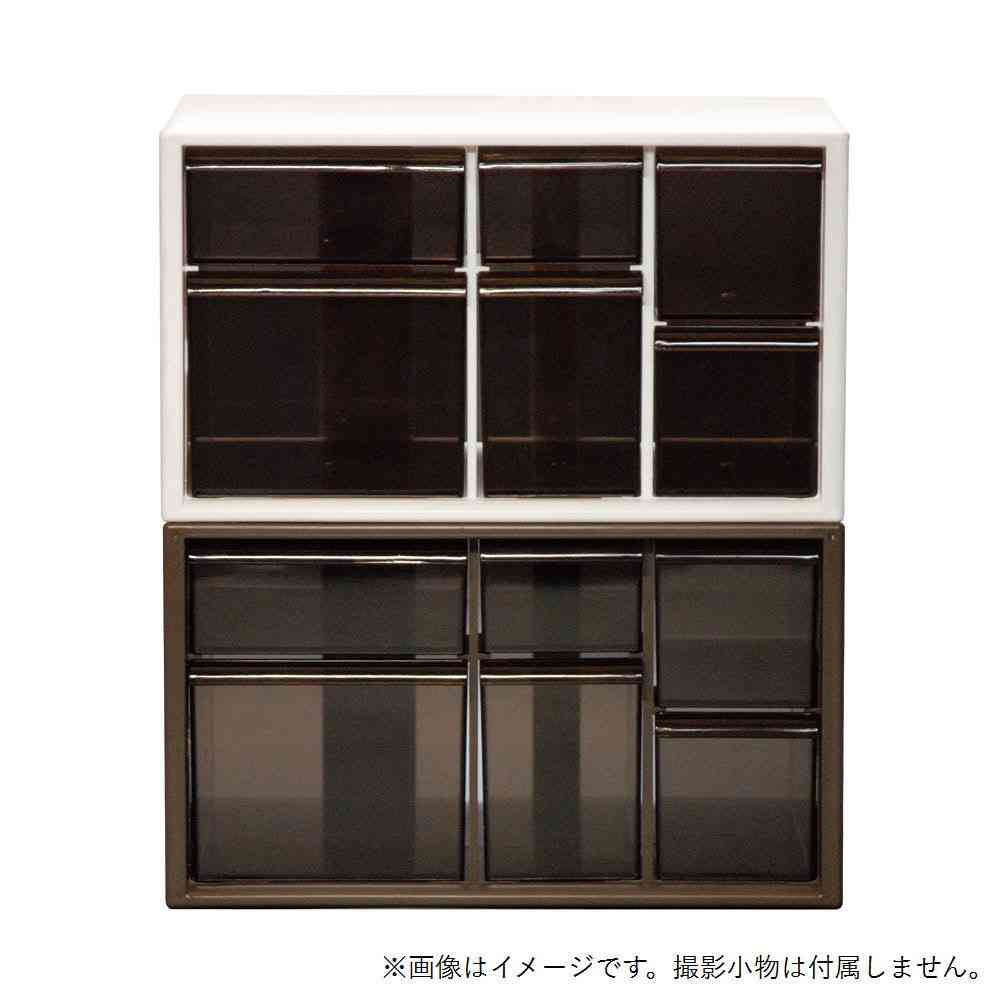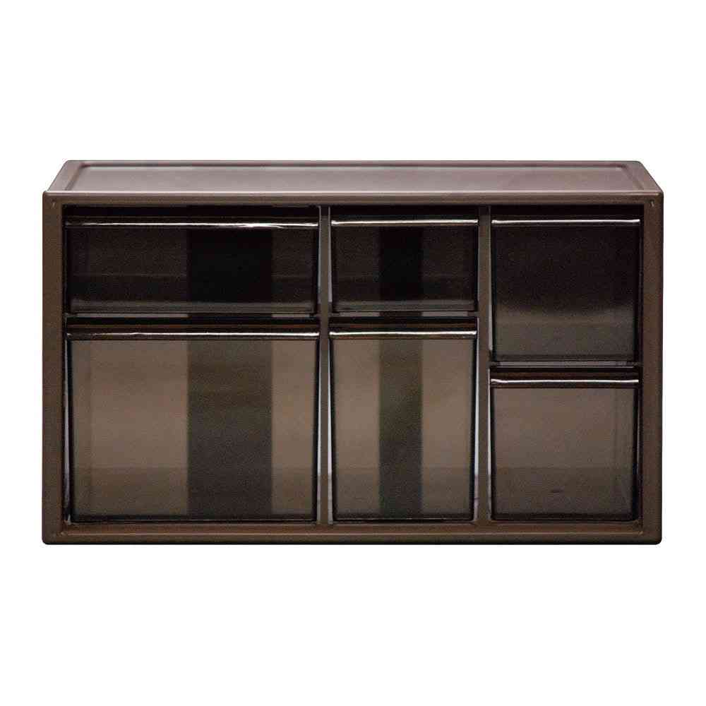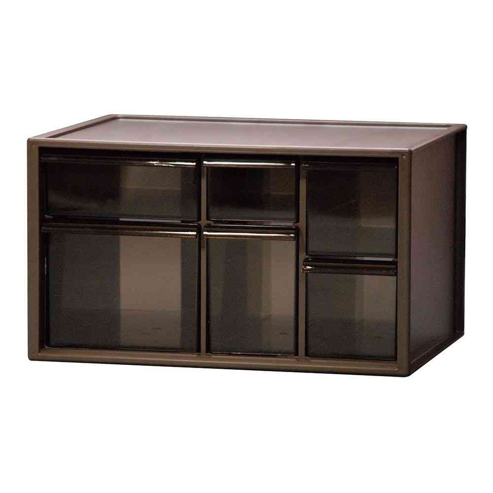 シンプルなデスクトップ収納ケース。 5種類の引き出しで、デスク周りの小物類の収納・整理におすすめ。 積み重ね可能です。
