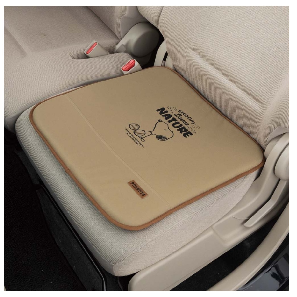 スヌーピーのプリントが可愛いシート用クッション キズや汚れに強い防水素材を使用したクッションで「PEANUTS」ロゴのワッペンがデザインのアクセント。 中材はウレタンフォームで程よい座り心地になります。