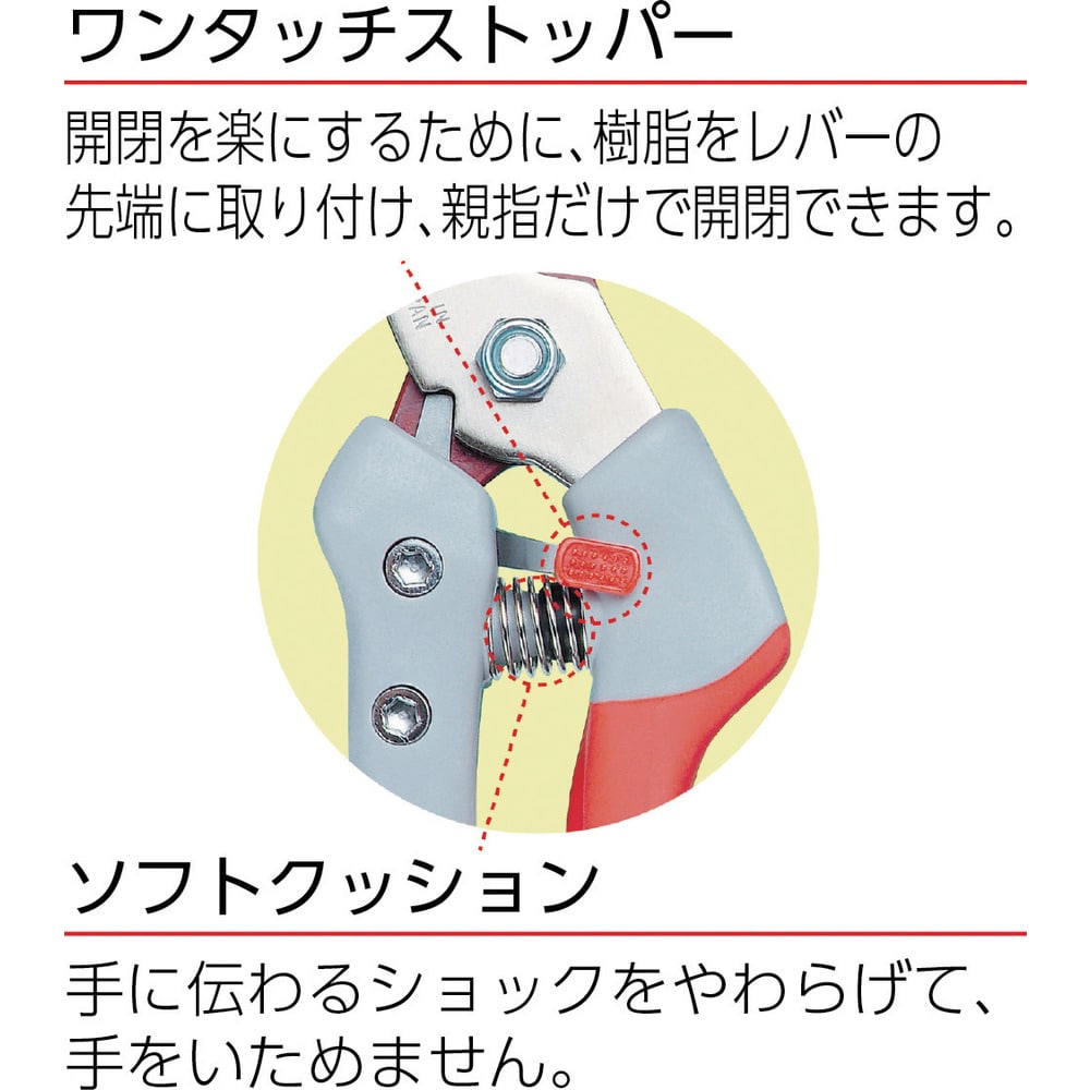 ●ソフトクッションで手の衝撃を吸収します。●ワンタッチストッパーにより、親指だけで開閉できます。●ヤニが付きにくいフッ素加工刃です。●グリップはガラス繊維入り樹脂で強く、またゴム質の樹脂も施しているので手が滑らず手によくなじみます。●手の小さい女性にも使いやすいです。●刃長(mm):45●全長(mm):185●色:黄/黒 質量170g