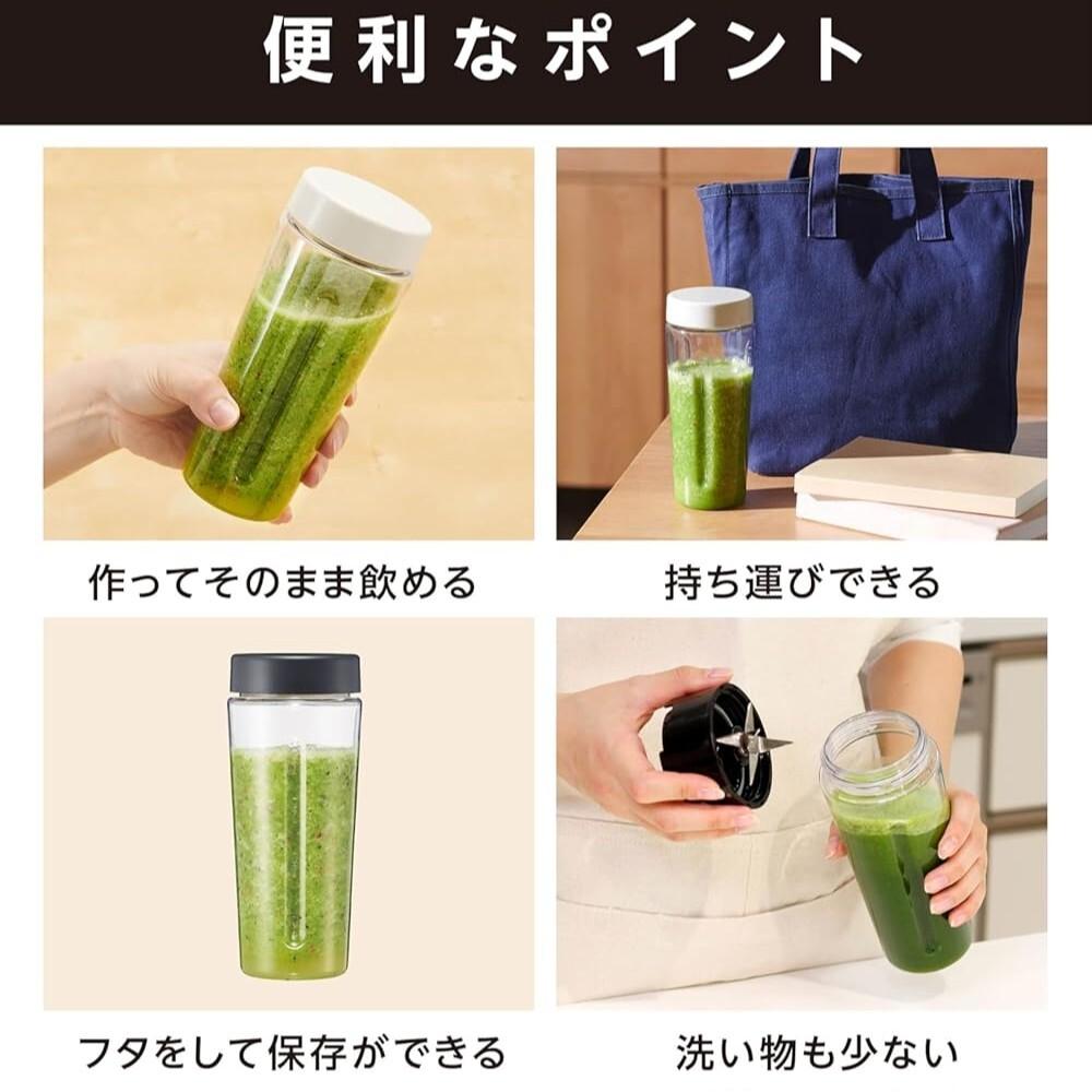 ●ボトルを上から押すとスイッチON。手を離すと止まるので、お好みの細かさに調整可能。 ●軽くて扱いやすい樹脂製ボトル。お手入れかんたんで、作ったボトルのまま飲めます。 ●持ち運びや保存にも便利なキャップ付き。 ●氷の粉砕もOKなステンレス製6枚刃ブレード。果物や野菜と一緒に氷を砕いて、冷たいスムージーも作れます。 ●本体重量:860g ●消費電力:160W ●カッターコーティング:ステンレス ●容量:400ml