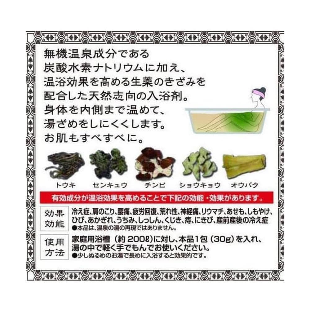 市販の入浴剤では得られない温浴感。 生薬の力を最大限に活用した揉み出しタイプ。 トウキ・オウバク・チンピなどの刻み生薬と温泉成分として知られている炭酸水素ナトリウムにアルモンド油等の保湿成分をバランス良く配合。