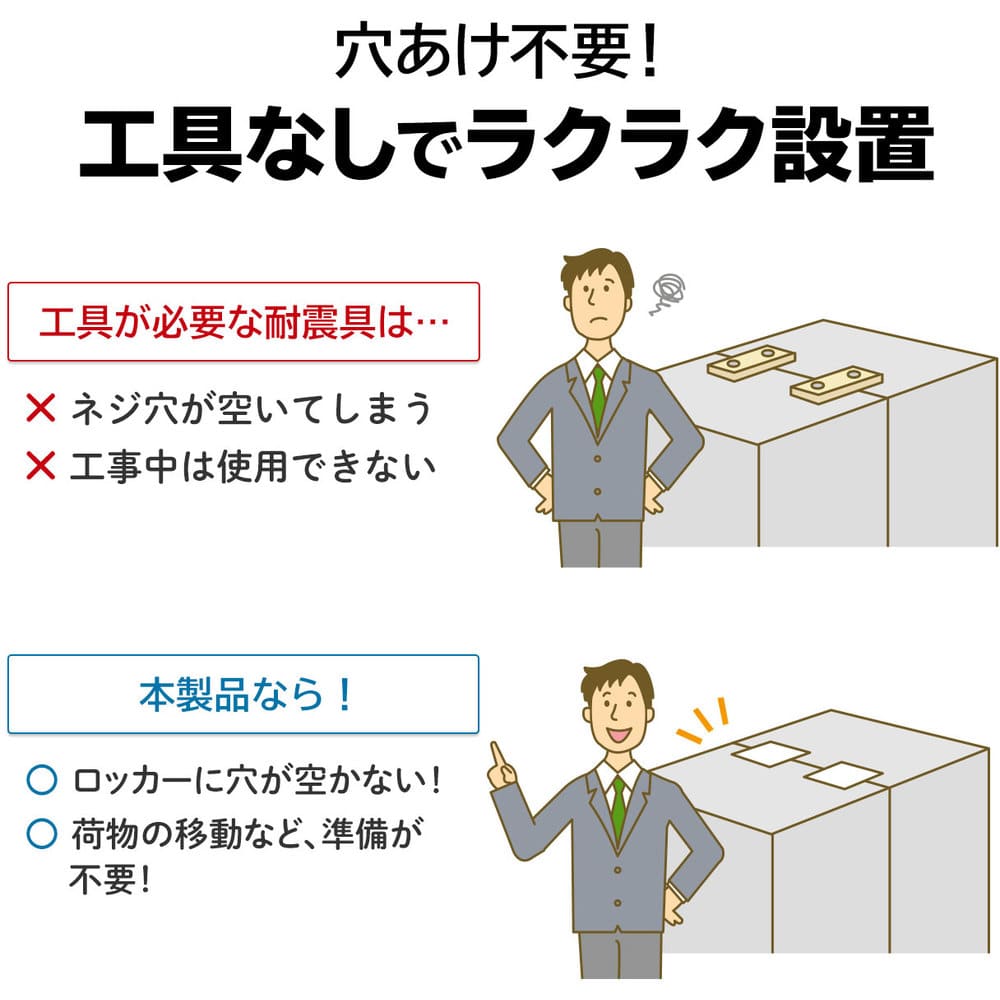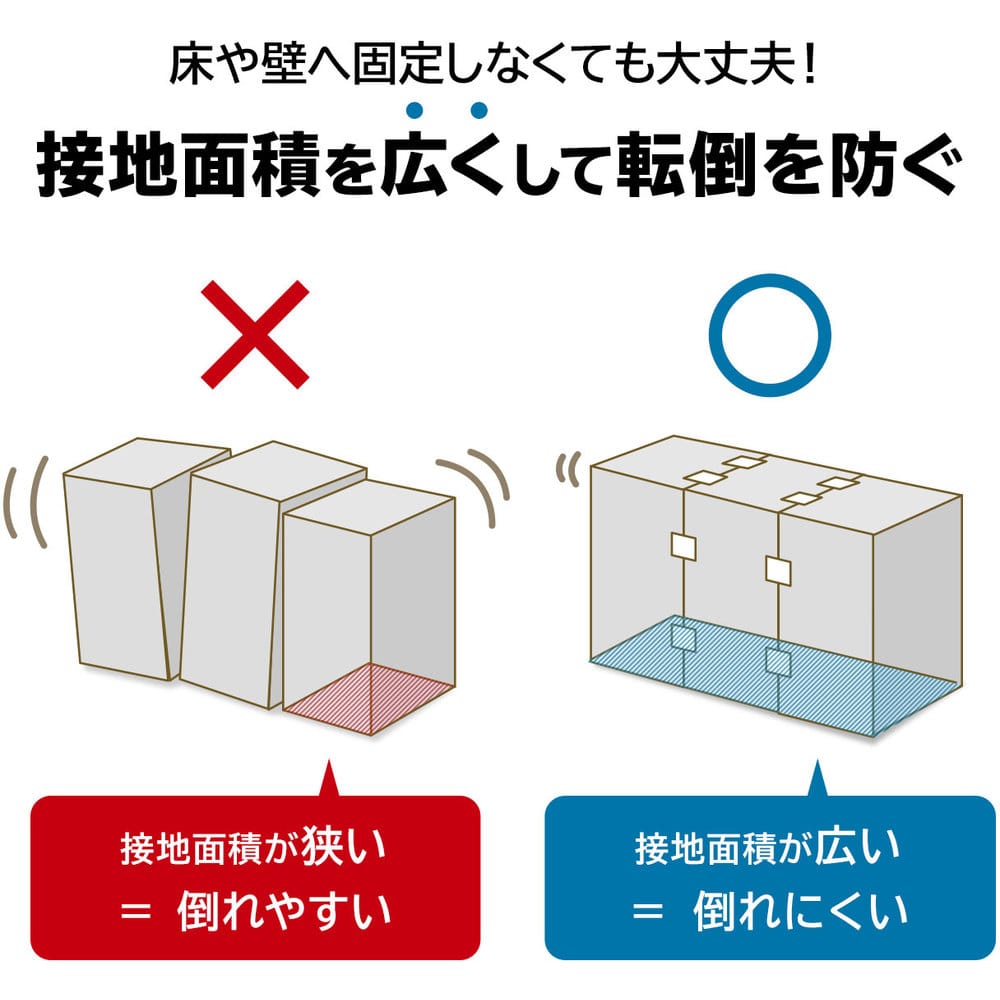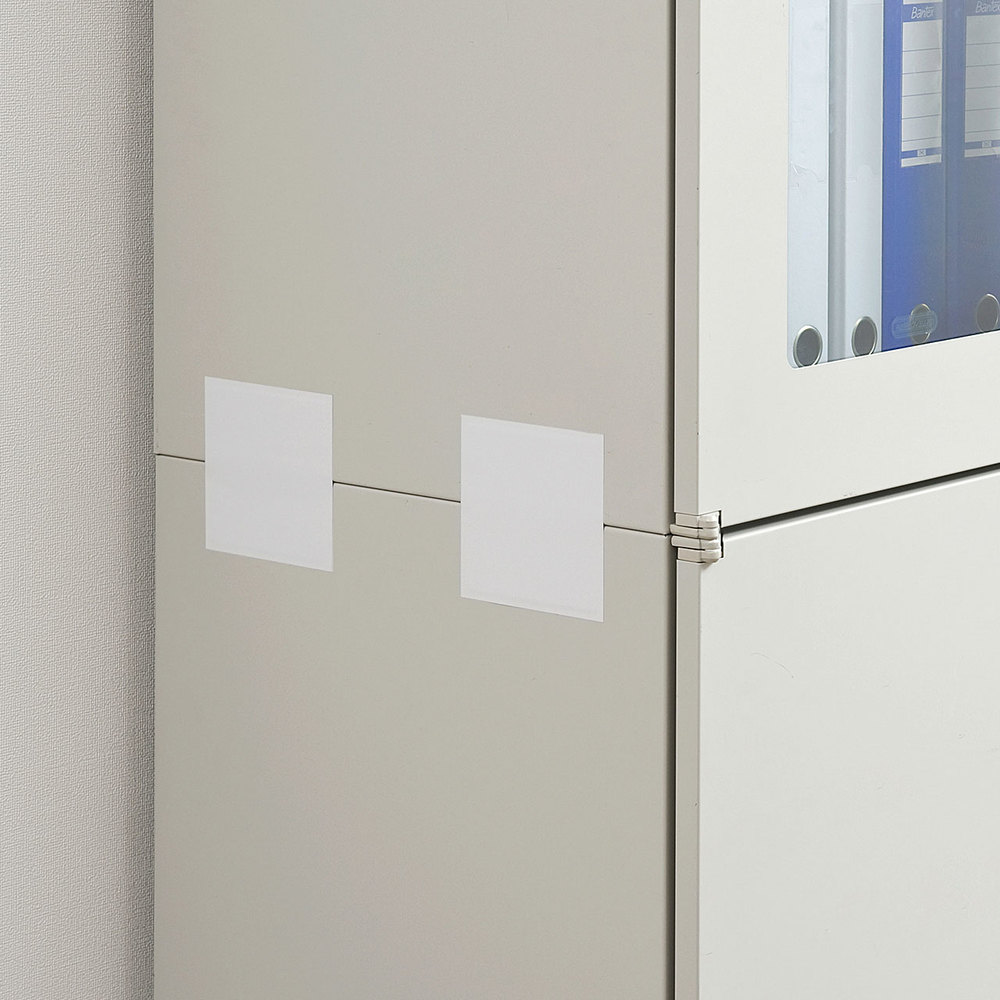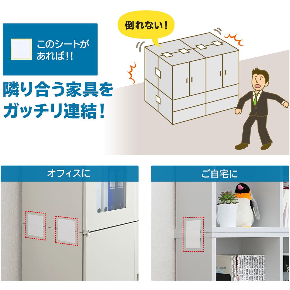 ●キャビネットを連結して転倒防止、隣り合うキャビネットや2段重ねキャビネットに貼るだけです。●キャビネットやロッカーなどの転倒や落下を防止します。●隣り合うキャビネットの天板間をまたぐように貼り付け、お互いを連結する事でキャビネットの転倒を防止します。●2段重ねされたキャビネットの境目をまたぐように貼り付け、上下のキャビネットを連結することで上段のキャビネットの落下を防止します。●接着固定の為、キャビットへのネジ止めや穴あけ工事が不要で、取り付けの際にキャビネットを動かす必要がありません。●キャビネット移設時に剥離可能で、非接着部をカッター等で切断することにより、簡単に剥離できます。●幅(mm):113奥行(mm):113高さ(mm):0.55●内容物:本体:4枚●使用環境温度:0~40度●せん断強度:100kg以下/枚 質量8g