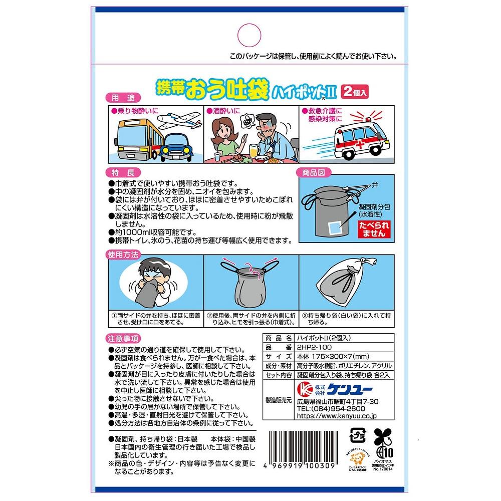 巾着式で使いやすい携帯おう吐袋です。 中の凝固剤が水分を固め、においを包みます。 袋には弁が付いており、ほほに密着させやすいためこぼれにくい構造になっています。 凝固剤は水溶性の袋に入っているため、使用時に粉が飛散しません。 約1000ml収容可能です。 携帯トイレ、氷のう、花苗の持ち運び等幅広く使用できます。 本体袋に使用方法を印刷しました。お徳用2個入りです。