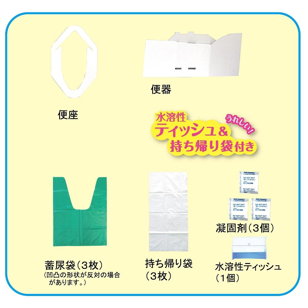 女性、幼児に便利な携帯簡易トイレです。 組み立て簡単、持ち運びが手軽です。 尿を素早く固め臭いを包みます。 セット内容:便器・便座 各1、蓄尿袋・凝固剤・持ち帰り袋 各3、水溶性ティッシュ1 1台の便器に蓄便袋、凝固剤、持ち帰り袋各3枚セットしております。 女性、お子様の遠出に安心です。 水溶性ティッシュ付属で安心です。 凝固剤に消臭剤を配合。 便器は繰り返し使用できます。
