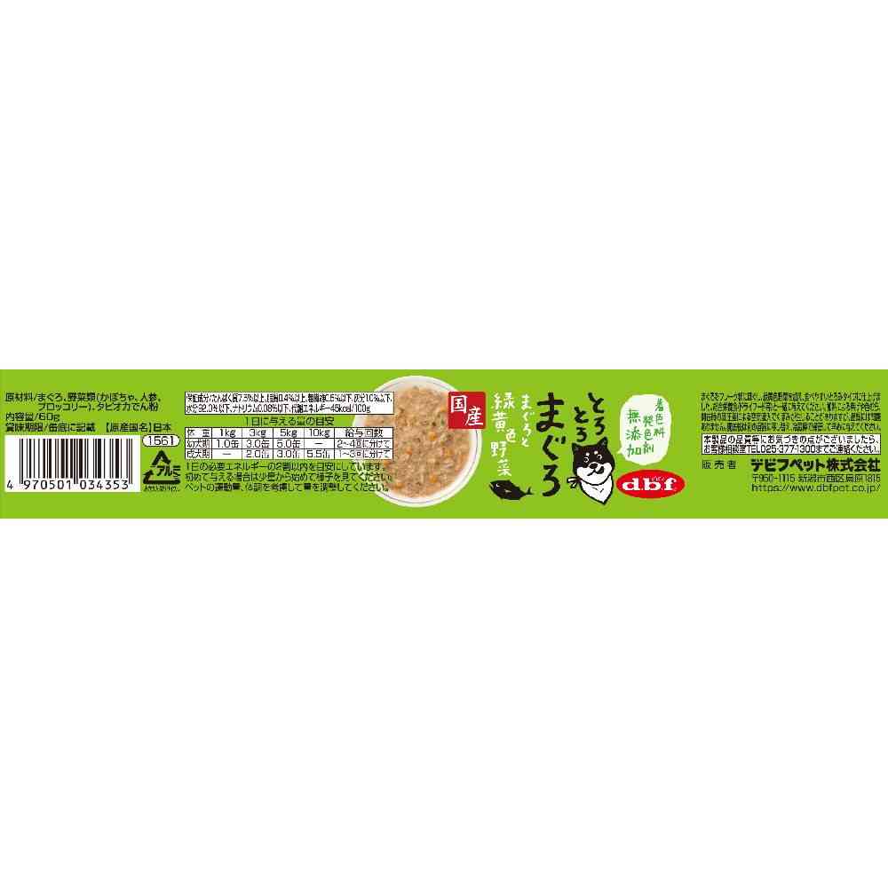 まぐろ、野菜類(かぼちゃ、人参、ブロッコリー)、タピオカでん粉 たんぱく質7.5%以上、脂質0.4%以上、粗繊維0.5%以下、灰分1.0%以下、水分92.0%以下、ナトリウム0.08%以下、代謝エネルギー45kcal/100g