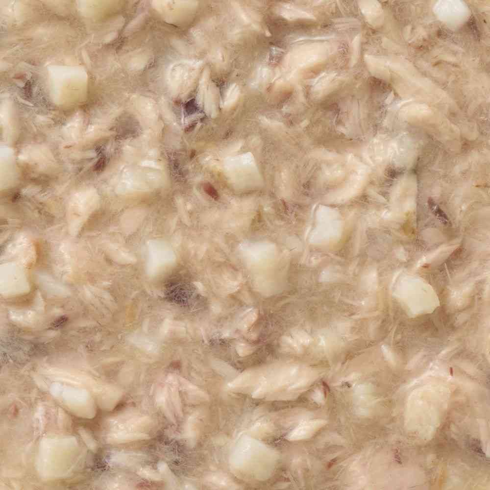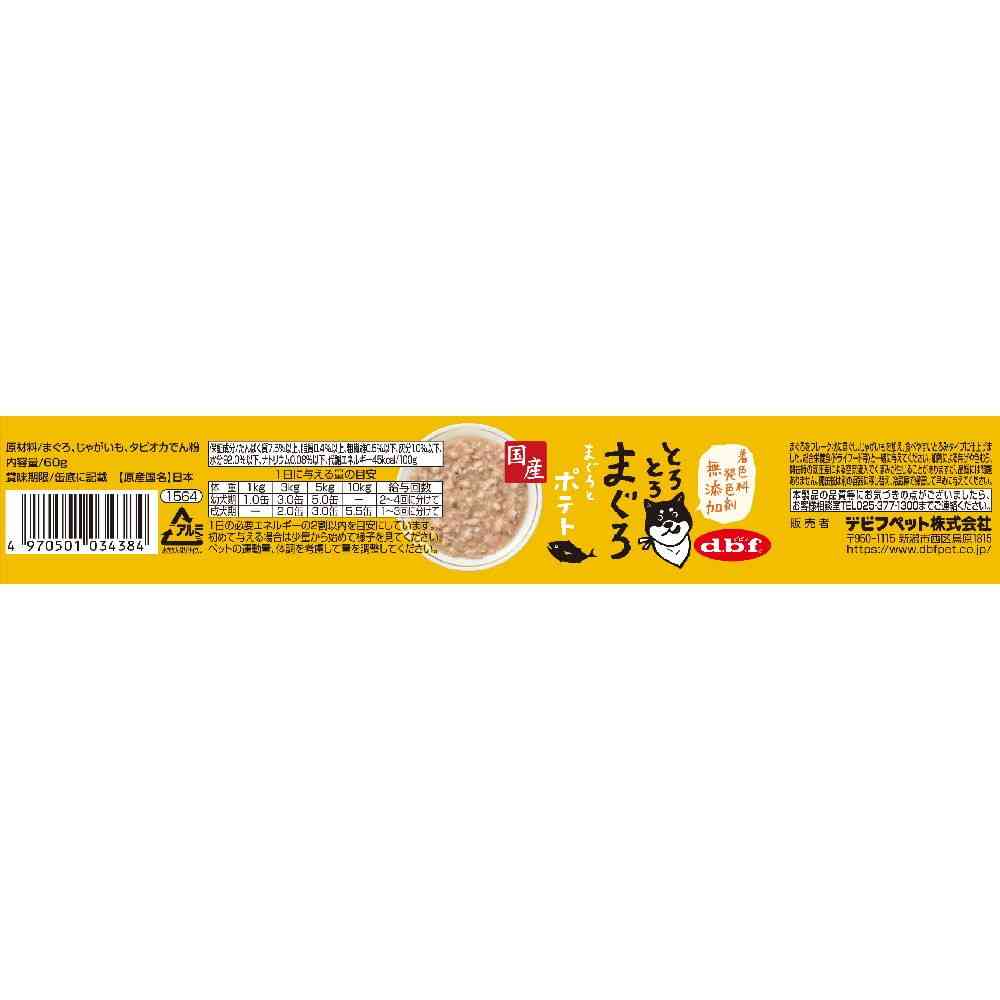 まぐろ、じゃがいも、タピオカでん粉 たんぱく質7.5%以上、脂質0.4%以上、粗繊維0.5%以下、灰分1.0%以下、水分92.0%以下、ナトリウム0.08%以下、代謝エネルギー45kcal/100g