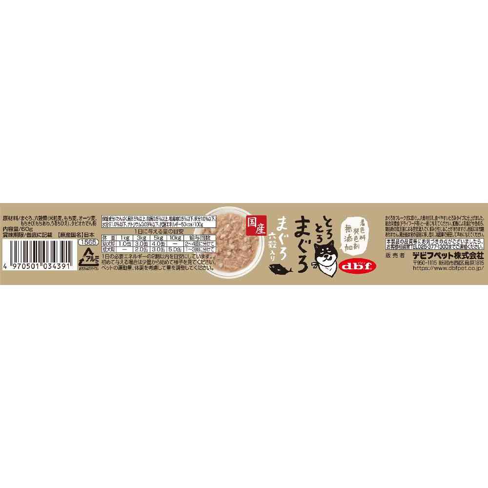 まぐろ、六穀類(米粒麦、もち麦、オーツ麦、もちきび、もちあわ、うるちひえ)、タピオカでん粉 たんぱく質8.5%以上、脂質0.5%以上、粗繊維0.5%以下、灰分1.0%以下、水分91.0%以下、ナトリウム0.09%以下、代謝エネルギー50kcal/100g