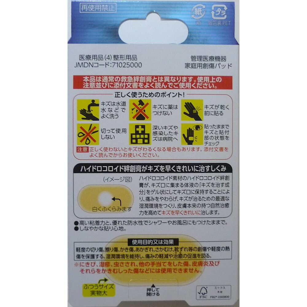 (1)感染が見られる傷(赤くなっていたり、膿をもっていたり、熱や腫れ等の異常が認められる傷)には使用しないでください。 ※にきび、湿疹、虫さされ、他の手当てをした傷、皮膚炎及びそれらをかきむしった傷などには使用できません。 (2)乾いた傷、かさぶたが既に出来ている傷には使用しないでください。 (3)使用前に傷と傷周辺を水道水などでよく洗浄してください。 (4)一度開封したもの、使用したものは再使用しないでください。 (5)キズより大きいサイズを使用してください。 (6)殺菌・消毒剤と本品を併用しないでください。 (7)小児の使用は保護者監督のもとで使用してください。 (8)3歳未満の乳幼児には使用しないでください。 (9)糖尿病や血行障害の治療を受けている方、アレルギー体質の方、薬やばんそうこう等で過敏症状を経験した事がある方は医師、薬剤師又は登録販売者に相談してください。 (10)使用期限の過ぎた商品は使用しないでください。