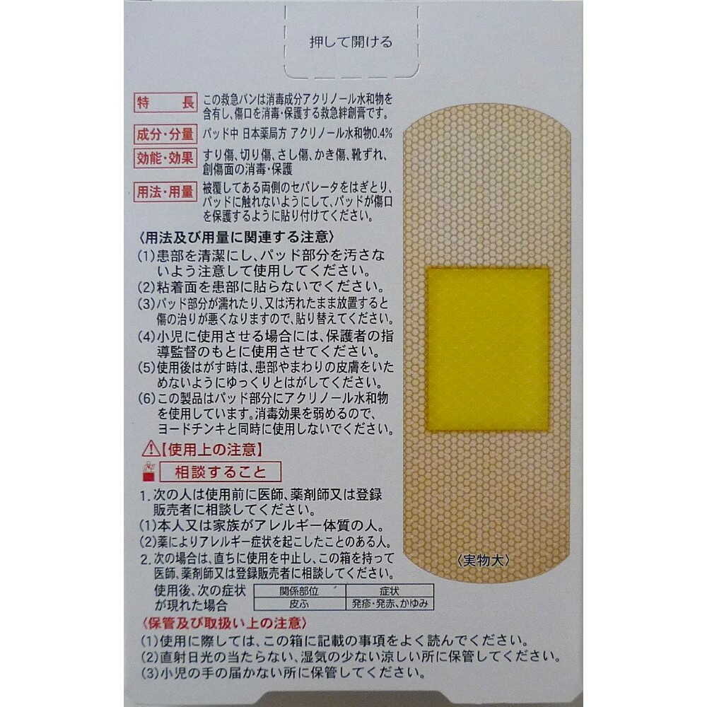 (1)患部を清潔にし、パッド部分を汚さないよう注意して使用してください。 (2)粘着面を患部に貼らないでください。 (3)パッド部分が濡れたり、又は汚れたまま放置すると傷の治りが悪くなりますので、新しいものに貼り替えてください。 (4)小児に使用させる場合には、保護者の指導監督のもとに使用させてください。 (5)使用後はがす時は、患部やまわりの皮膚をいためないようにゆっくりとはがしてください。 (6)この製品は、パッド部分にアクリノール水和物を使用しています。消毒効果を弱めるのでヨードチンキと同時に使用しないでください。 (7)本人又は家族がアレルギー体質の人、薬によりアレルギー症状を起こしたことがある人は使用前に医師、薬剤師又は登録販売者に相談してください。 (8)本品の使用により、発疹・発赤、かゆみ、かぶれ等の症状が現れた場合には、使用を中止し、医師、薬剤師又は登録販売者に相談してください。