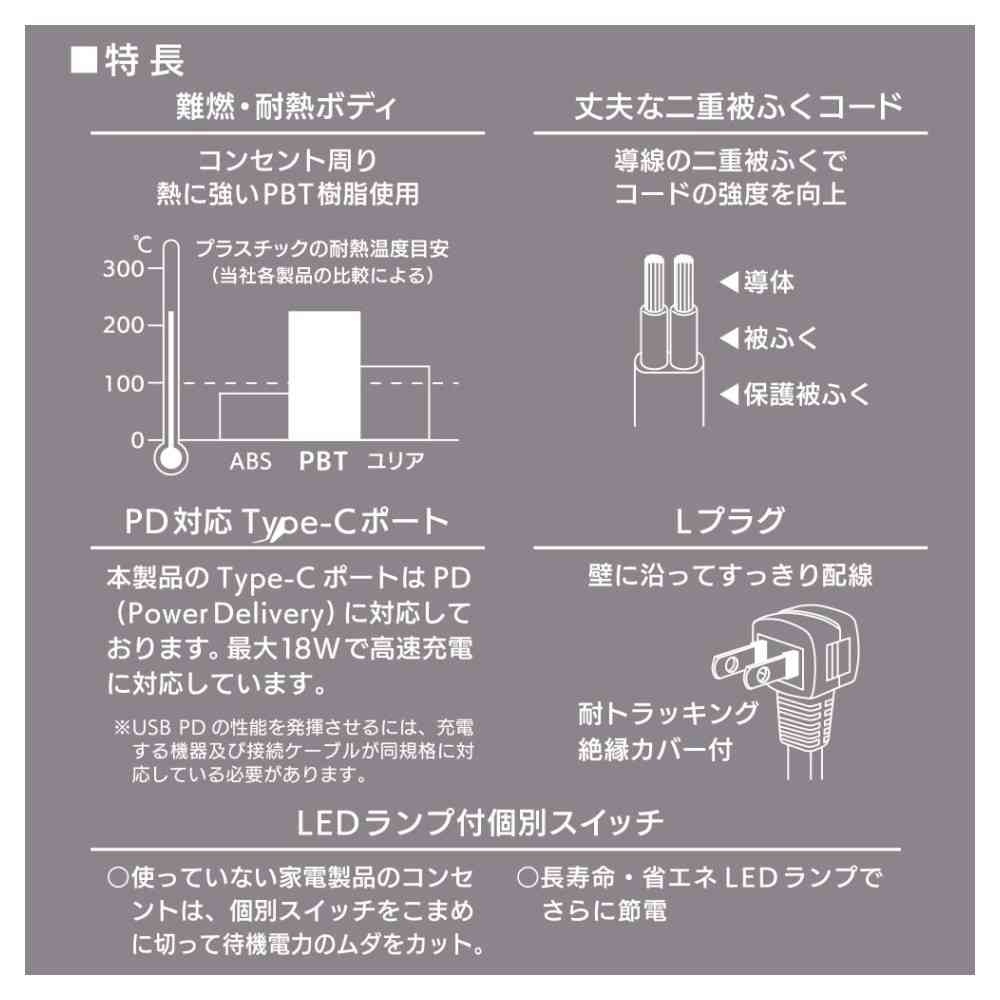 ● USB Type-CはPD(Power Delivery)対応、最大18Wで急速充電 ● USB差込口はType-C×1、Type-A×1 ● TypeA+TypeC両方使用時、合計3.4A出力 ● AC差込口(3口)はLEDランプ付個別スイッチ装備、出力合計1400Wまで ● コンセント周りは熱に強いPBT樹脂使用 ● 導線の二重被ふくコードでコードの強化を向上 ● Lプラグ(耐トラッキング絶縁カバー付)で壁に沿ってすっきり配線