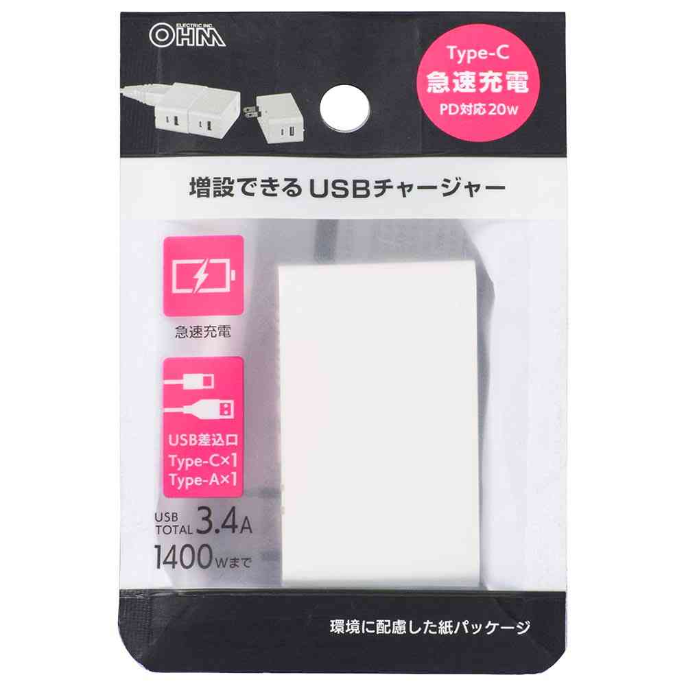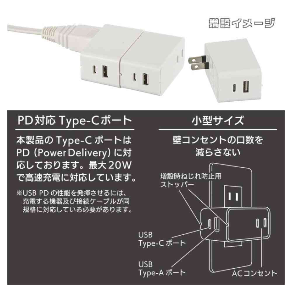 増設できる、USBチャージャー、Type-C、急速充電 PD対応、20W、USB差込口、Type-C、Type-A、USB、TOTAL3.4A、AC出力、合計1400Wまで、小型サイズ、効率よく充電、ホワイト