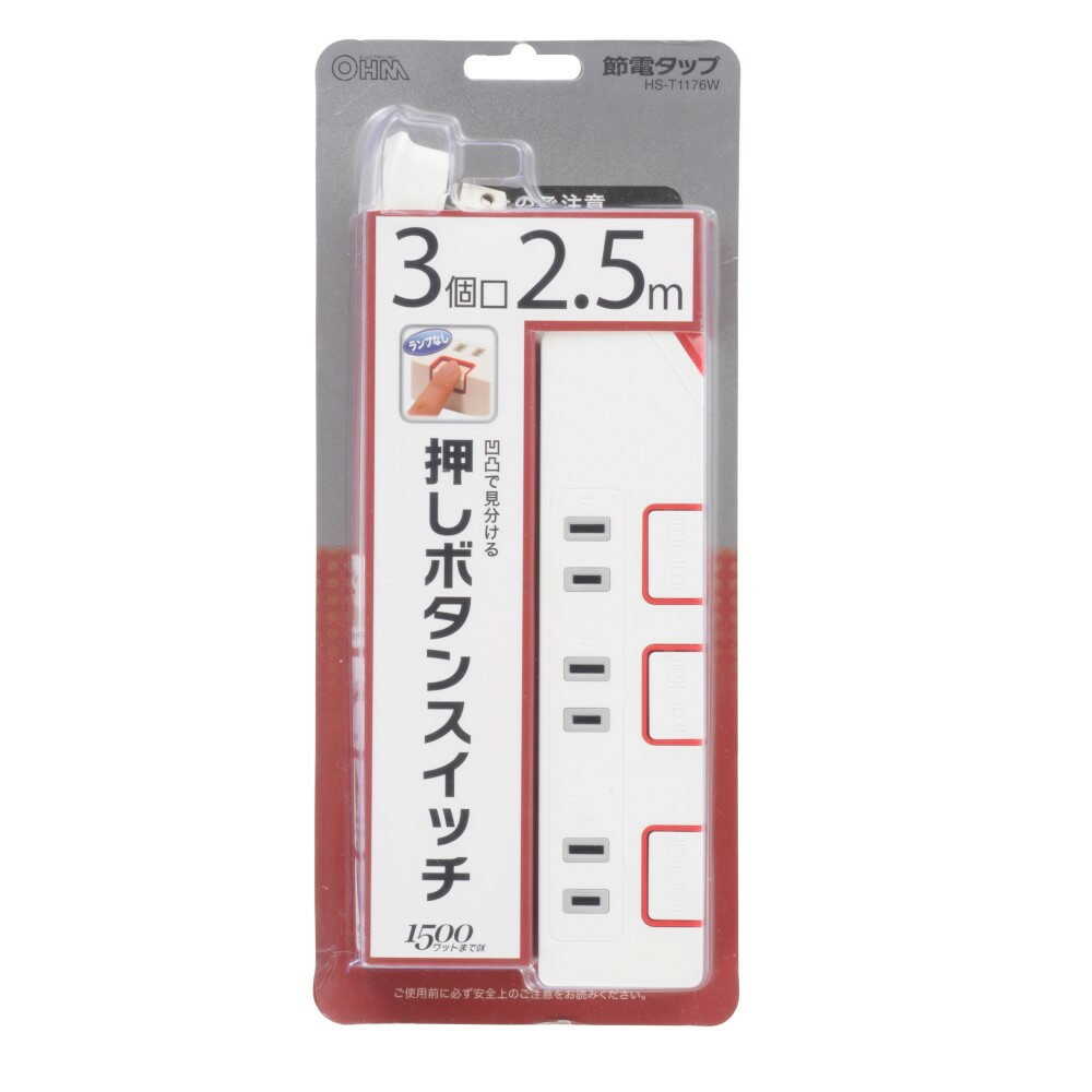 押しボタン式省エネスイッチ、難燃性樹脂使用、熱に強い、丈夫な二重被ふくコード、絶縁カバー付きL型プラグ