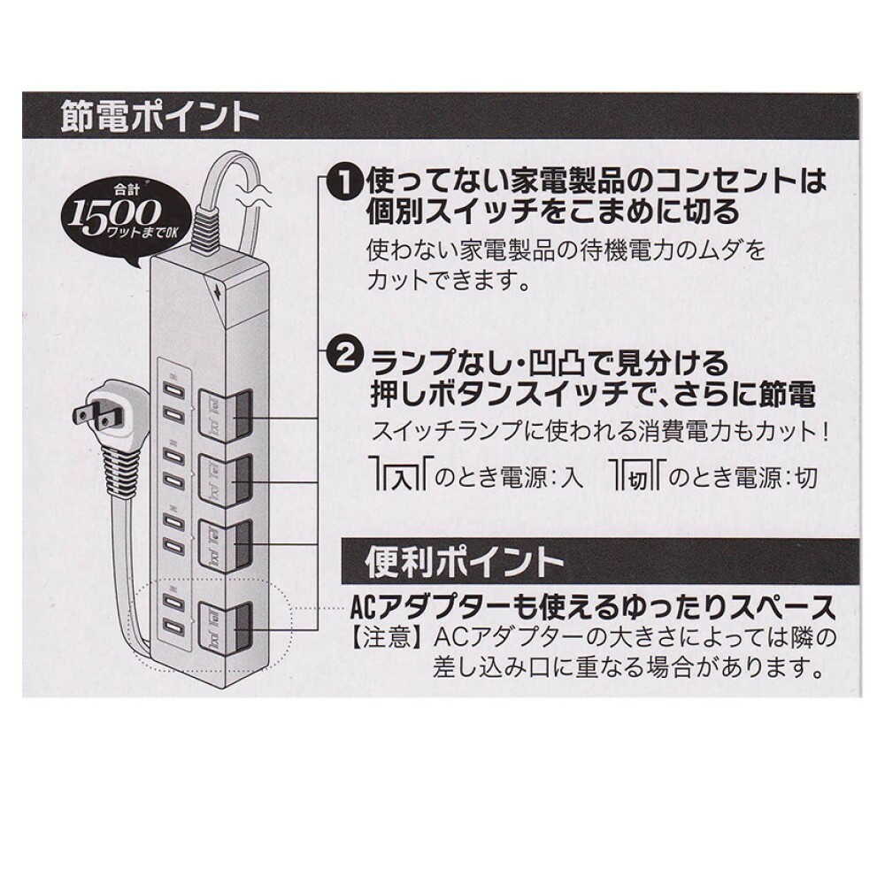 雷サージ軽減素子内蔵、落雷時のダメージを軽減、押しボタン式個別スイッチ付き、シャッターコンセント、ホコリによる火災、いたずらによる感電を防ぐ、ACアダプターも使える、ゆったりスペースコンセント付き、丈夫な二重被ふくコード、絶縁カバー付きL型プラグ