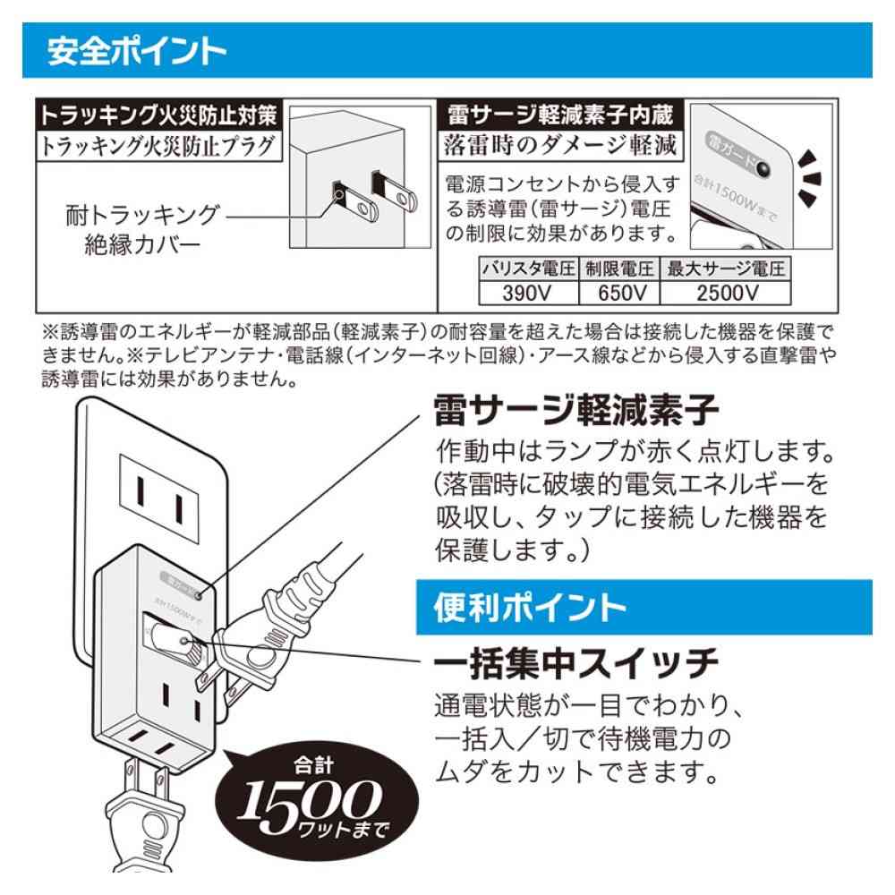● 雷サージ軽減素子内蔵 ● LED点灯式集中スイッチ付き ● 絶縁カバー付きプラグで、トラッキング火災を防止します。