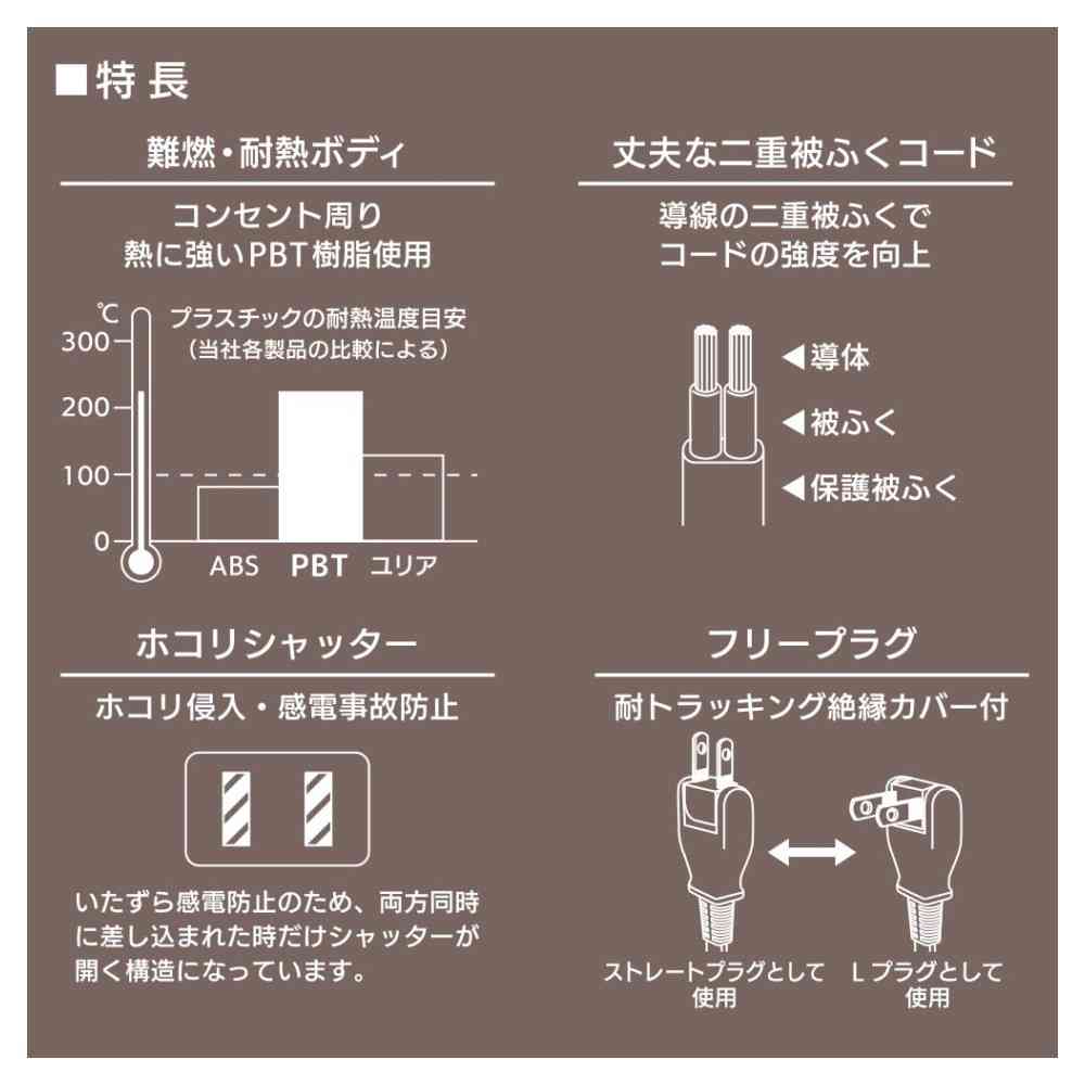ホコリシャッター、ホコリ侵入防止、感電事故防止、耐トラッキング、絶縁カバー付き、フリープラグ、コンセント周り、PBT樹脂使用、熱に強い、難燃、耐熱ボディ、二重被ふくコード、丈夫