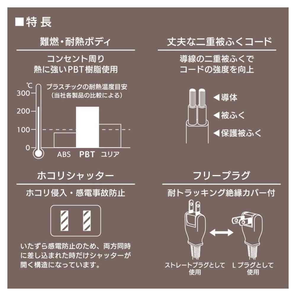 コンセント周り、PBT樹脂使用、熱に強い、難燃、耐熱ボディ、導線、二重被ふくコード、同時差し込み時のみ開くシャッター、ホコリシャッター、ホコリ侵入防止、感電事故防止、耐トラッキング、絶縁カバー付き、フリープラグ