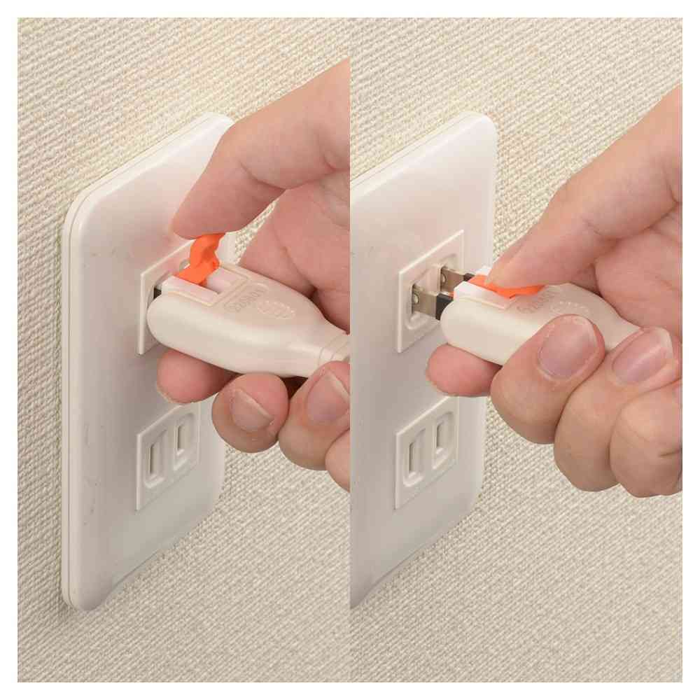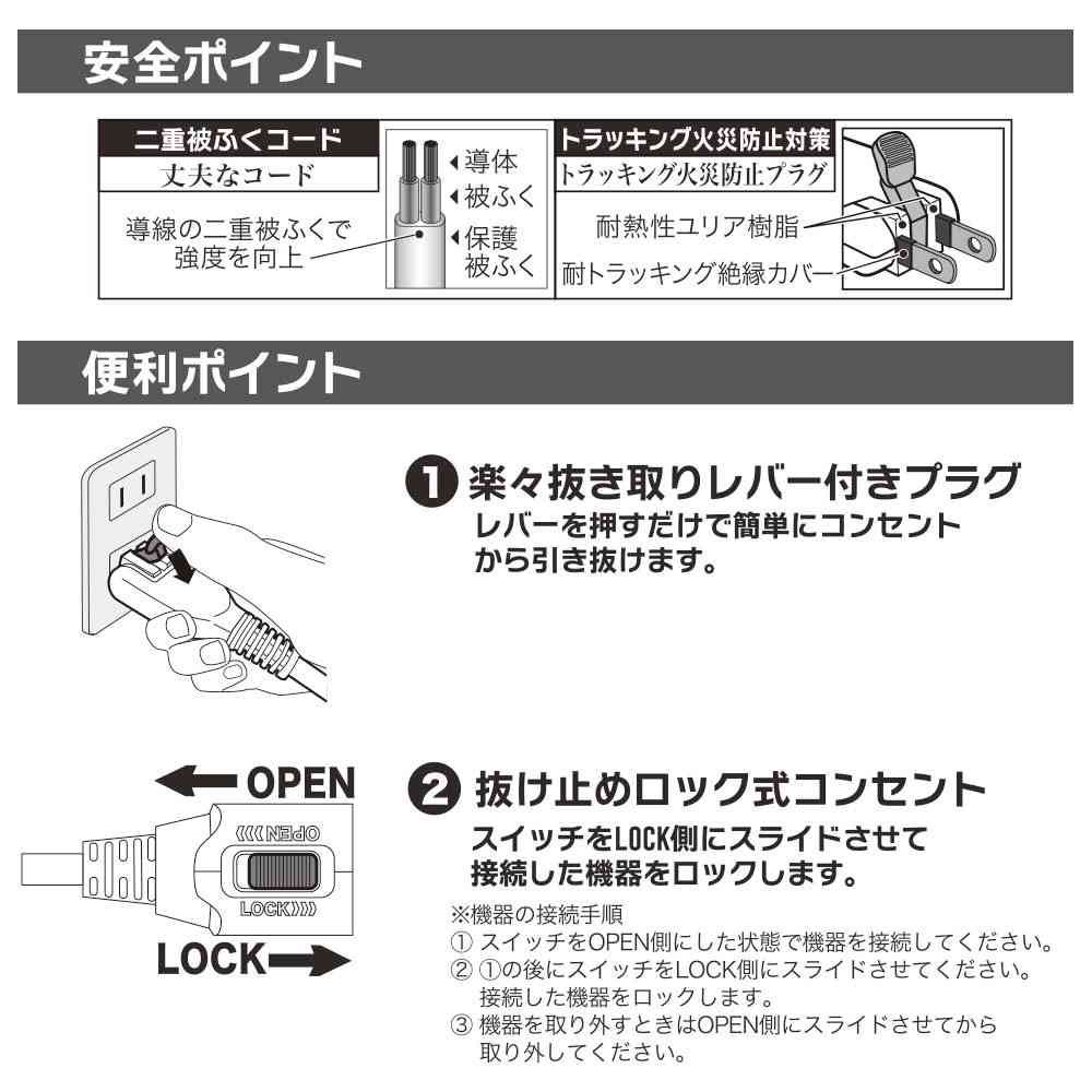 ● レバーを押すだけで簡単にコンセントから引き抜けます ● スイッチをLOCK側にスライドさせて接続した機器をロックします ● トラッキング火災防止対策 ● 丈夫な二重被ふくコード