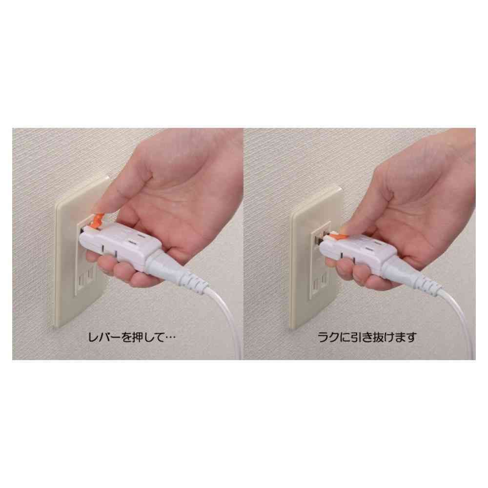 ● 楽々抜取りレバーで力を使わずにコンセントから引き抜けます。 ● トラッキング火災を防止する絶縁カバー付