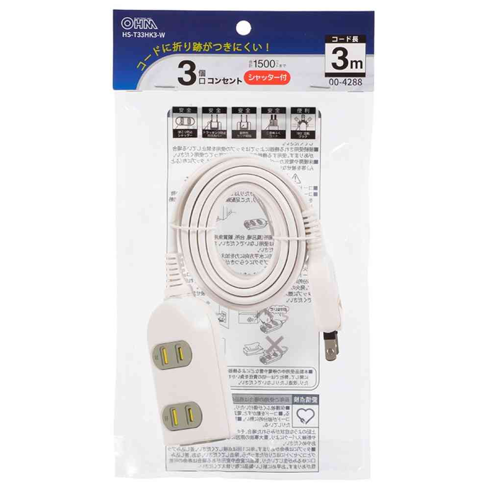 ● コードに折り跡がつきにくい ● ほこり防止シャッター付で安全 ● 消費電力合計1500ワットまで ● 二重被ふくコード ● 便利な180°回転プラグ ● トラッキング防止(耐熱性ユリア樹脂、トラッキング防止絶縁カバー)