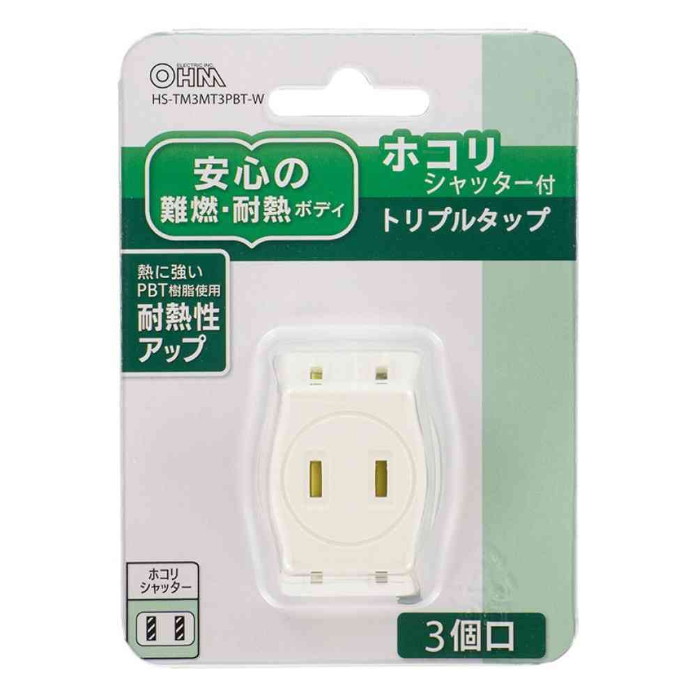 ほこり防止シャッター、トリプルタップ、難燃ボディ、耐熱設計、PBT樹脂、3分配、トラッキング防止プラグ、白