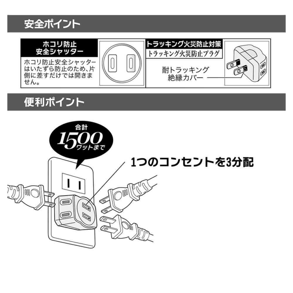 ● ホコリシャッター付トリプルタップ ● 安心の難燃・耐熱ボディ ● 熱に強いPBT樹脂使用で耐熱性アップ ● 1つのコンセントを3分配 ● ホコリ防止安全シャッター ● トラッキング火災防止プラグ
