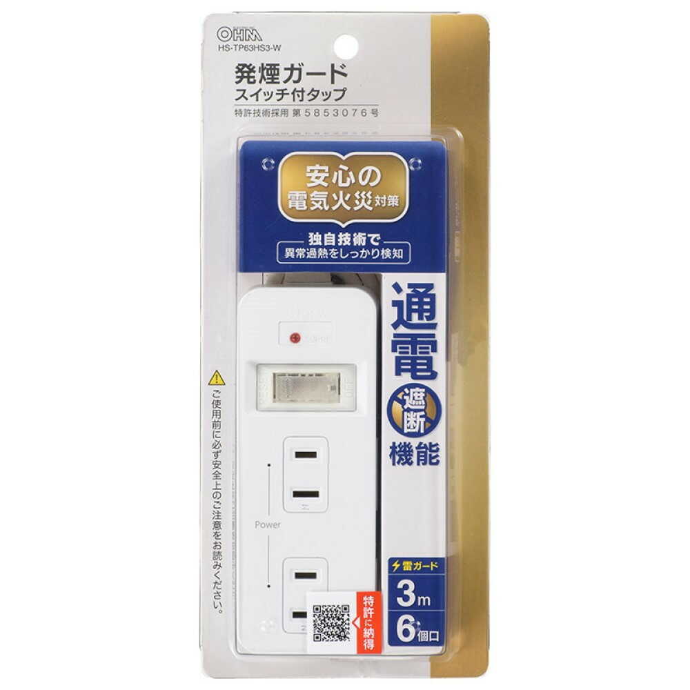 通電火災対策、特許技術採用、特許第5853076号、差込口の温度が150度、発煙に至る前に自動的に通電を遮断、雷ガード機能付き、雷サージ軽減素子内蔵、落雷時のダメージを軽減、過電流防止ブレーカー付き、一括集中スイッチ、容量オーバーによる過電流を感知、ブレーカーが作動、集中スイッチ、トラッキング火災防止プラグ、丈夫な二重被ふくコード、通電表示LEDランプ付き