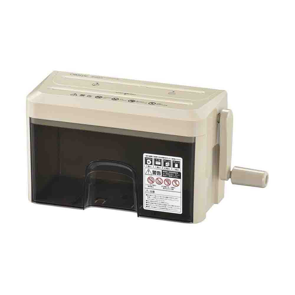 シュレッダー、卓上に、コンパクト、手動式、マイクロクロスカット、回しやすい大型ハンドル、引き出し式ダストボックスで、ごみ捨ても楽、最大細断枚数2枚、細断サイズ2mm×10mm、CD/DVD3分割、カード最大5分割、ダストボックス容量約3.8リットル