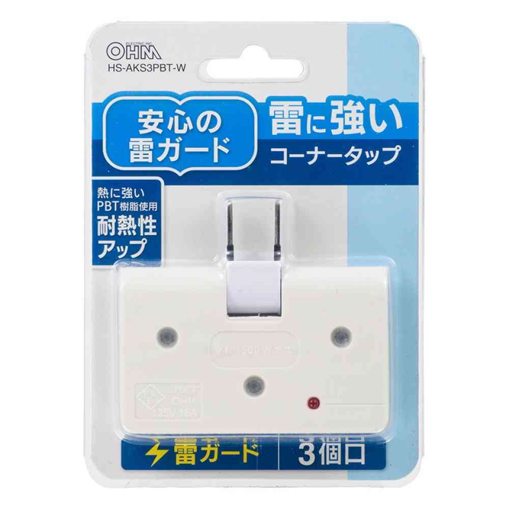 雷対策、コーナータップ、雷ガード、PBT樹脂、耐熱設計、3分配、雷サージ軽減、トラッキング防止、白