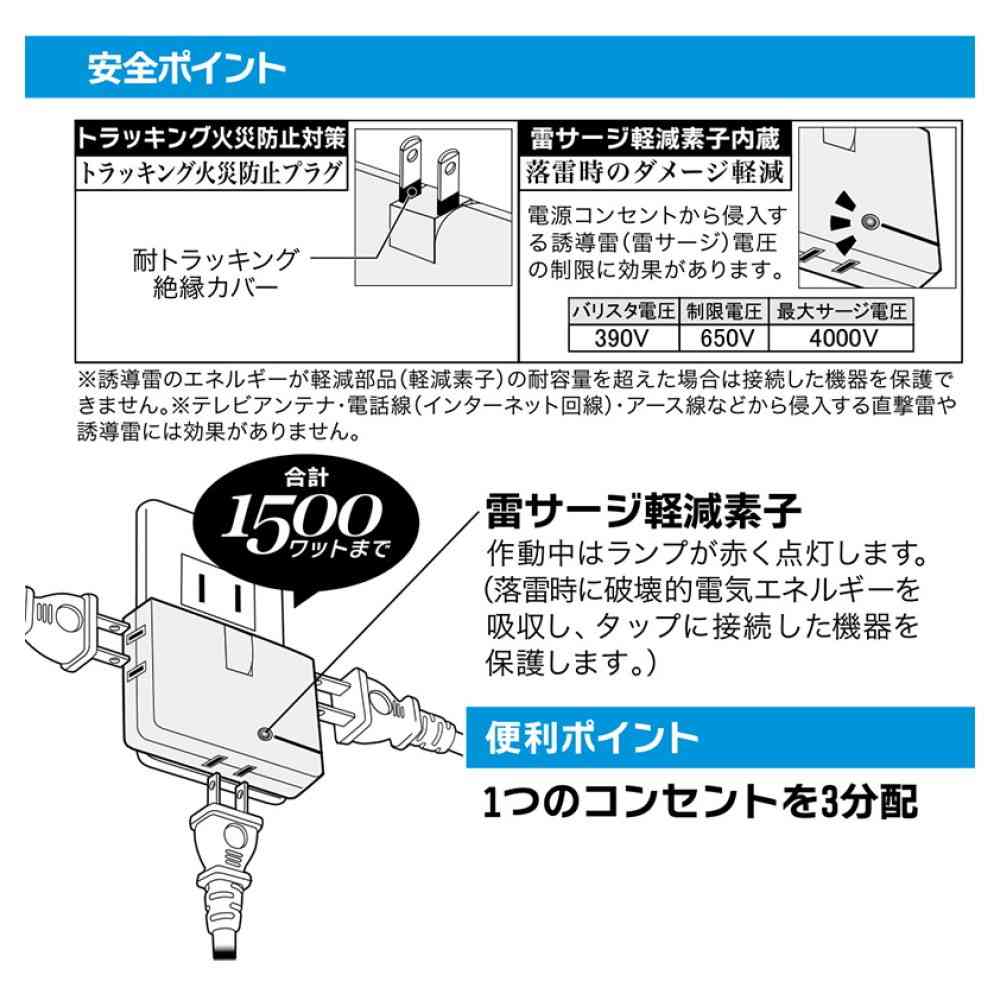 ● 雷に強いコーナータップ ● 安心の雷ガード ● 熱に強いPBT樹脂使用で耐熱性アップ ● 1つのコンセントを3分配 ● 雷サージ軽減素子内蔵 ● トラッキング火災防止対策