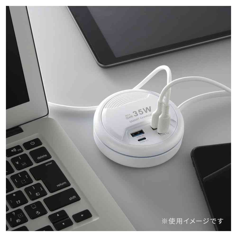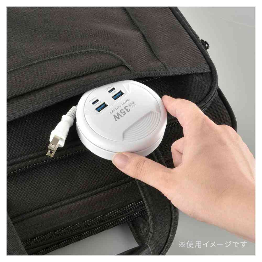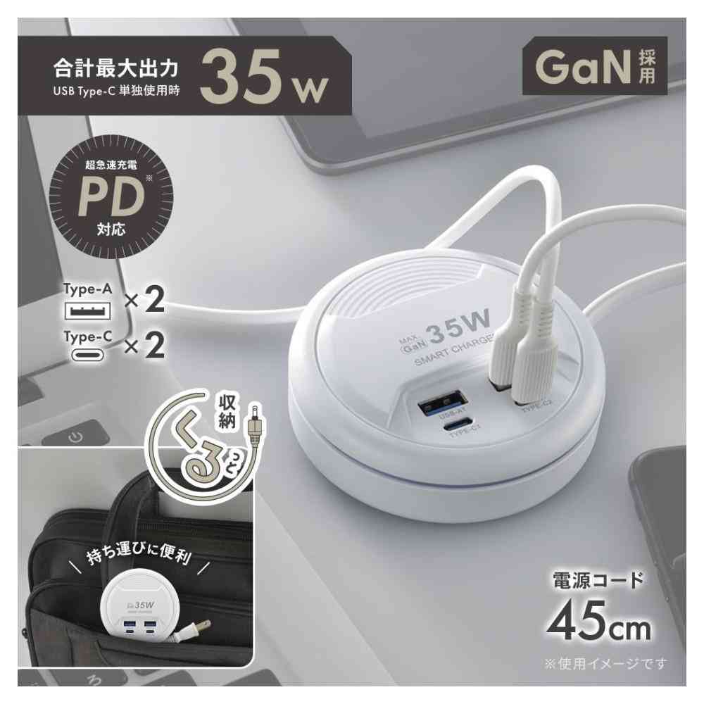 ● 合計最大出力 35W(USB Type-C 単独使用時) ● くるっと収納 ● 持ち運びに便利 ● 超急速充電PD対応 ※Power Delivery急速充電には、Power Deliveryに対応した端末、各種ケーブルが必要です ● Type-A×2、Type-C×2 ● 耐圧や熱伝導、高速性に優れた特長を持つ次世代素材GaNを採用 ● 接続機器を自動で判別して適切な電力で効率よく充電できます