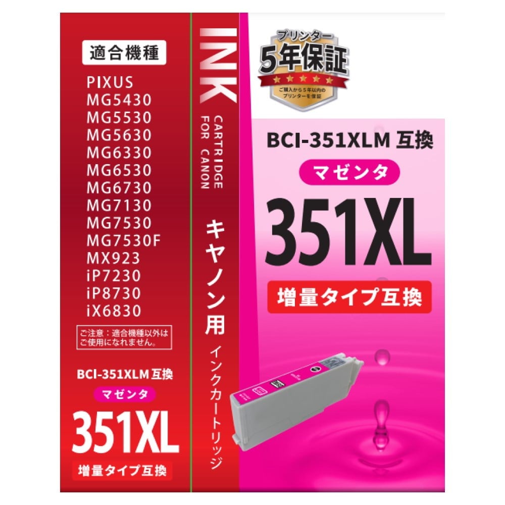 キヤノン、純正インクカートリッジ、BCI-351XLM、染料マゼンタ、互換インクカートリッジ、1個入り、残量表示完全対応、増量タイプ、プリンター5年間保証対象品