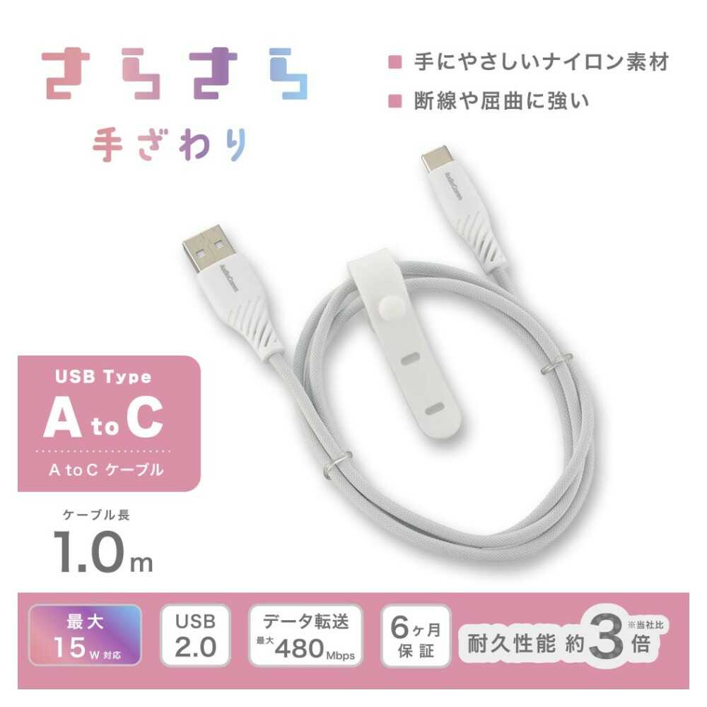 ケーブル表面処理、さわり心地の良い、ナイロンメッシュ素材、断線、屈曲、強い素材を使用、当社従来品、約3倍、耐久性を実現、USB、Type-C、最大15W、5V、3A、USB2.0、対応、最大480Mbps、速度、高速データ転送可能、束ね幅を調節、ケーブルバンド付き、6ヶ月間保証、カラー、グレー